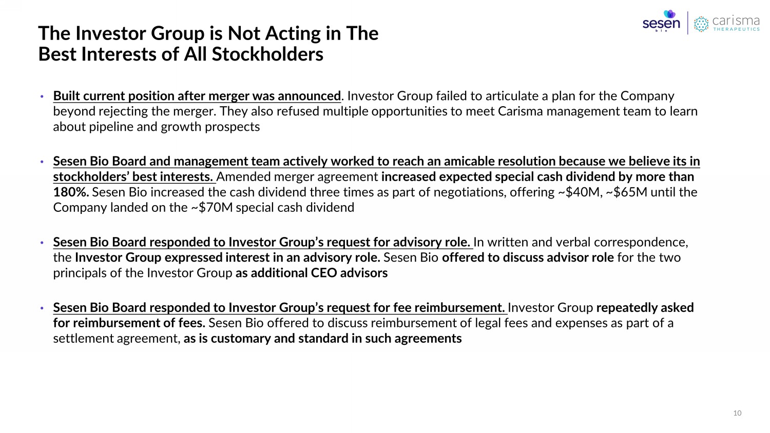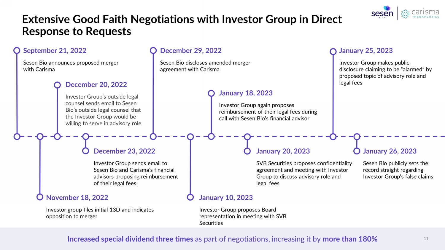 The Investor Group is Not Acting in The Best Interests of All Stockholders 10 • Built current position after merger was announced . Investor Group failed to articulate a plan for the Company beyond rejecting the merger. They also refused multiple opportunities to meet Carisma management team to learn about pipeline and growth prospects • Sesen Bio Board and management team actively worked to reach an amicable resolution because we believe its in stockholders’ best interests. Amended merger agreement increased expected special cash dividend by more than 180%. Sesen Bio increased the cash dividend three times as part of negotiations, offering ~$40M, ~$65M until the Company landed on the ~$70M special cash dividend • Sesen Bio Board responded to Investor Group’s request for advisory role. In written and verbal correspondence, the Investor Group expressed interest in an advisory role. Sesen Bio offered to discuss advisor role for the two principals of the Investor Group as additional CEO advisors • Sesen Bio Board responded to Investor Group’s request for fee reimbursement. Investor Group repeatedly asked for reimbursement of fees. Sesen Bio offered to discuss reimbursement of legal fees and expenses as part of a settlement agreement, as is customary and standard in such agreements
