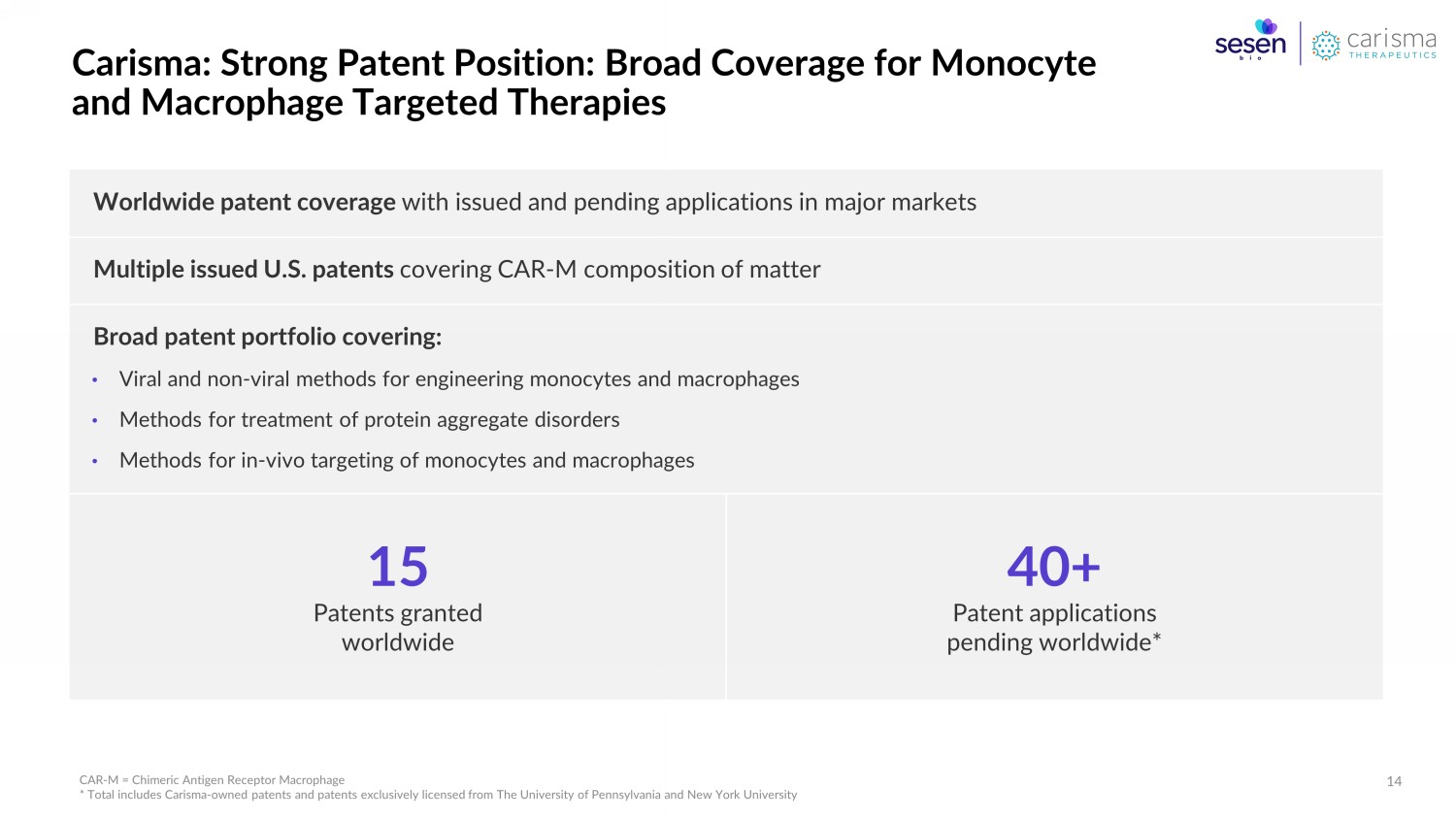 Attractive Discounted Cash Flow Value Implied equity value 1 range of ~$225M to ~$335M, above $196M proposed Carisma valuation 2 Leader in the CAR - M Space Believed to be the only company to have demonstrated proof of mechanism and safety data in this therapy through human clinical trials Strategic Attractiveness to Leading Biopharma Companies The Company’s CAR - M technology has broad applicability across multiple tumor types and has attracted strategic interest from leading biotechnology and pharmaceutical companies including Moderna, Novartis, AbbVie, and Merck Significant Upcoming Value Inflection Points Several upcoming value inflection points expected over next 18 months, including multiple clinical readouts, the first of which is expected in mid - 2023 Carisma : Valuation is Attractive and Supported by Rigorous Analysis and Strategic Rationale 13 Source: Sesen Bio Definitive Proxy Statement (1/19/23), Company website 1 Range of implied Carisma equity value per discounted cash flow analysis of SVB Securities as set forth in the definitive proxy statement/prospectus fi le d by Sesen Bio with the SEC on January 19, 2023 2 Per Merger Agreement