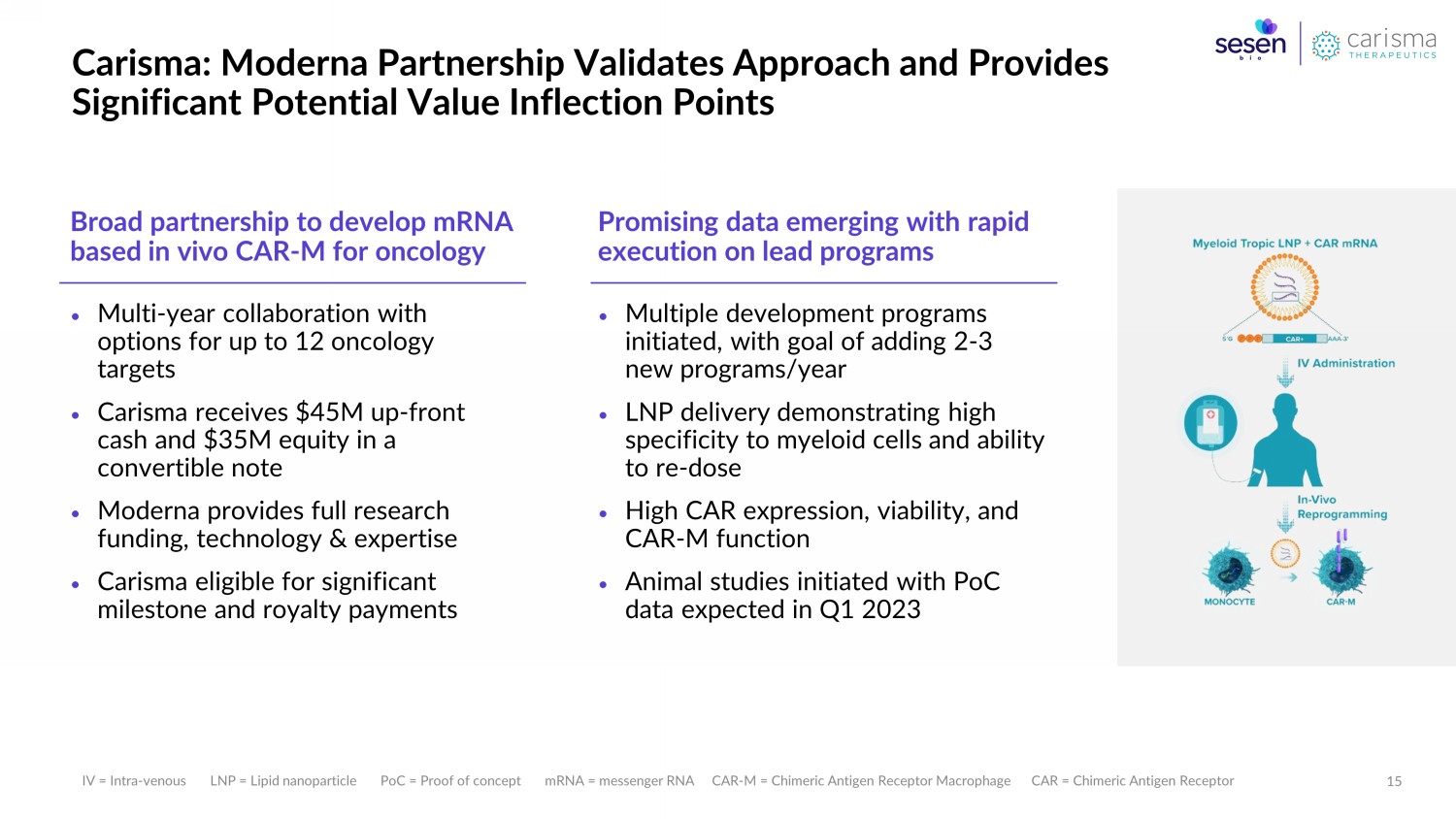 Worldwide patent coverage with issued and pending applications in major markets Multiple issued U.S. patents covering CAR - M composition of matter Broad patent portfolio covering: • Viral and non - viral methods for engineering monocytes and macrophages • Methods for treatment of protein aggregate disorders • Methods for in - vivo targeting of monocytes and macrophages 15 Patents granted worldwide 40+ Patent applications pending worldwide* CAR - M = Chimeric Antigen Receptor Macrophage * Total includes Carisma - owned patents and patents exclusively licensed from The University of Pennsylvania and New York University Carisma : Strong Patent Position: Broad Coverage for Monocyte and Macrophage Targeted Therapies 14