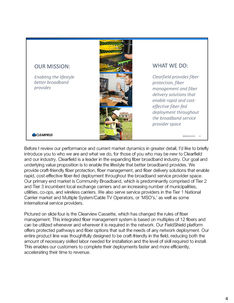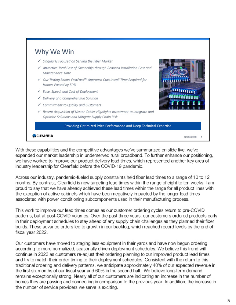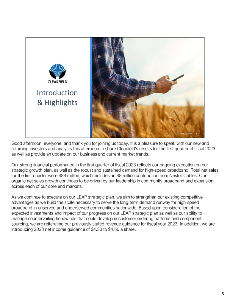 Important Cautions Regarding Forward - Looking Statements Forward - looking statements contained herein and in any related presentation or in the related Earnings Release are made pursuant to the safe harbor provisions of the Private Litigation Reform Act of 1995. Words such as “may,” “will,” “expect,” “believe,” “anticipate,” “estimate,” “outlook,” or “continue” or comparable terminology are intended to identify forward - looking statements. Such forward looking statements include, for example, statements about the Company’s future revenue and operating performance, anticipated shipping on backlog and future lead times, future availability of components and materials from the Company’s supply chain, future availability of labor impacting our customers’ network builds, the impact of the Rural Digital Opportunity Fund (RDOF) or other government programs on the demand for the Company’s products or timing of customer orders, the Company’s ability to add capacity to meet expected future demand, and trends in and growth of the FTTx markets, market segments or customer purchases and other statements that are not historical facts. These statements are based upon the Company's current expectations and judgments about future developments in the Company's business. Certain important factors could have a material impact on the Company's performance, including, without limitation: adverse global economic conditions and geopolitical issues could have a negative effect on our business, and results of operations and financial condition; our planned growth may strain our business infrastructure, which could adversely affect our operations and financial condition; the acquisition of Nestor Cables and integration activities could adversely affect our operating results; the COVID - 19 pandemic has significantly impacted worldwide economic conditions and could have a material adverse effect on our business, financial condition and operating results; we rely on single - source suppliers, which could cause delays, increases in costs or prevent us from completing customer orders; fluctuations in product and labor costs which may not be able to be passed on to customers that could decrease margins; we depend on the availability of sufficient supply of certain materials, such as fiber optic cable and resins for plastics, and global disruptions in the supply chain for these materials could prevent us from meeting customer demand for our products; we rely on our manufacturing operations to produce product to ship to customers and manufacturing constraints and disruptions could result in decreased future revenue; a significant percentage of our sales in the last three fiscal years have been made to a small number of customers; further consolidation among our customers may result in the loss of some customers and may reduce sales during the pendency of business combinations and related integration activities; we may be subject to risks associated with acquisitions; product defects or the failure of our products to meet specifications could cause us to lose customers and sales or to incur unexpected expenses; we are dependent on key personnel; cyber - security incidents on our information technology systems, including ransomware, data breaches or computer viruses, could disrupt our business operations, damage our reputation, and potentially lead to litigation; our business is dependent on interdependent management information systems; to compete effectively, we must continually improve existing products and introduce new products that achieve market acceptance; changes in government funding programs may cause our customers and prospective customers to delay, reduce, or accelerate purchases, leading to unpredictable and irregular purchase cycles; intense competition in our industry may result in price reductions, lower gross profits and loss of market share; our success depends upon adequate protection of our patent and intellectual property rights; if the telecommunications market does not expand as we expect, our business may not grow as fast as we expect; we face risks associated with expanding our sales outside of the United States; and other factors set forth in Part I, Item IA. Risk Factors of Clearfield's Annual Report on Form 10 - K for the year ended September 30, 2022 as well as other filings with the Securities and Exchange Commission. The Company undertakes no obligation to update these statements to reflect actual events unless required by law. NASDAQ:CLFD 2 © Copyright 2023 Clearfield, Inc. All Rights Reserved. Please note that during this call, management will be making forward - looking statements regarding future events and the future financial performance of the Company. These forward - looking statements are subject to risks and uncertainties that could cause actual results to differ materially from those in the forward - looking statements. It’s important to note also that the Company undertakes no obligation to update such statements except as required by law. The Company cautions you to consider risk factors that could cause actual results to differ materially from those in the forward - looking statements contained in today’s press release, FieldReport, and in this conference call. The risk factors section in Clearfield’s most recent Form 10 - K filing with the Securities and Exchange Commission and its subsequent filings on Form 10 - Q provides descriptions of those risks. As a reminder, the slides in this presentation are controlled by you, the listener. Please advance forward through the presentation as the speakers present their remarks. With that, I would like to turn the call over to Clearfield’s President and CEO, Cheri Beranek. Cheri? 2