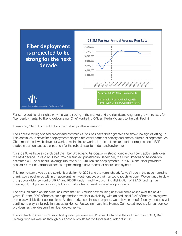 Providing Optimized Price Performance and Deep Technical Expertise Why We Win x Singularly Focused on Serving the Fiber Market x Attractive Total Cost of Ownership through Reduced Installation Cost and Maintenance Time x Our Testing Shows FastPass TM Approach Cuts Install Time Required for Homes Passed by 50% x Ease, Speed, and Cost of Deployment x Delivery of a Comprehensive Solution x Commitment to Quality and Customers x Recent Acquisition of Nestor Cables Highlights Investment to Integrate and Optimize Solutions and Mitigate Supply Chain Risk NASDAQ:CLFD 5 5 With these capabilities and the competitive advantages we’ve summarized on slide five, we’ve expanded our market leadership in underserved rural broadband. To further enhance our positioning, we have worked to improve our product delivery lead times, which represented another key area of industry leadership for Clearfield before the COVID - 19 pandemic. Across our industry, pandemic - fueled supply constraints held fiber lead times to a range of 10 to 12 months. By contrast, Clearfield is now targeting lead times within the range of eight to ten weeks. I am proud to say that we have already achieved these lead times within the range for all product lines with the exception of active cabinets which have been negatively impacted by the longer lead times associated with power conditioning subcomponents used in their manufacturing process. This work to improve our lead times comes as our customer ordering cycles return to pre - COVID patterns, but at post - COVID volumes. Over the past three years, our customers ordered products early in their deployment schedules to stay ahead of any supply chain challenges as they planned their fiber builds. These advance orders led to growth in our backlog, which reached record levels by the end of fiscal year 2022. Our customers have moved to staging less equipment in their yards and have now begun ordering according to more normalized, seasonally driven deployment schedules. We believe this trend will continue in 2023 as customers re - adjust their ordering planning to our improved product lead times and try to match their order timing to their deployment schedules. Consistent with the return to this traditional ordering and delivery patterns, we anticipate approximately 40% of our expected revenue in the first six months of our fiscal year and 60% in the second half. We believe long - term demand remains exceptionally strong. Nearly all of our customers are indicating an increase in the number of homes they are passing and connecting in comparison to the previous year. In addition, the increase in the number of service providers we serve is exciting.