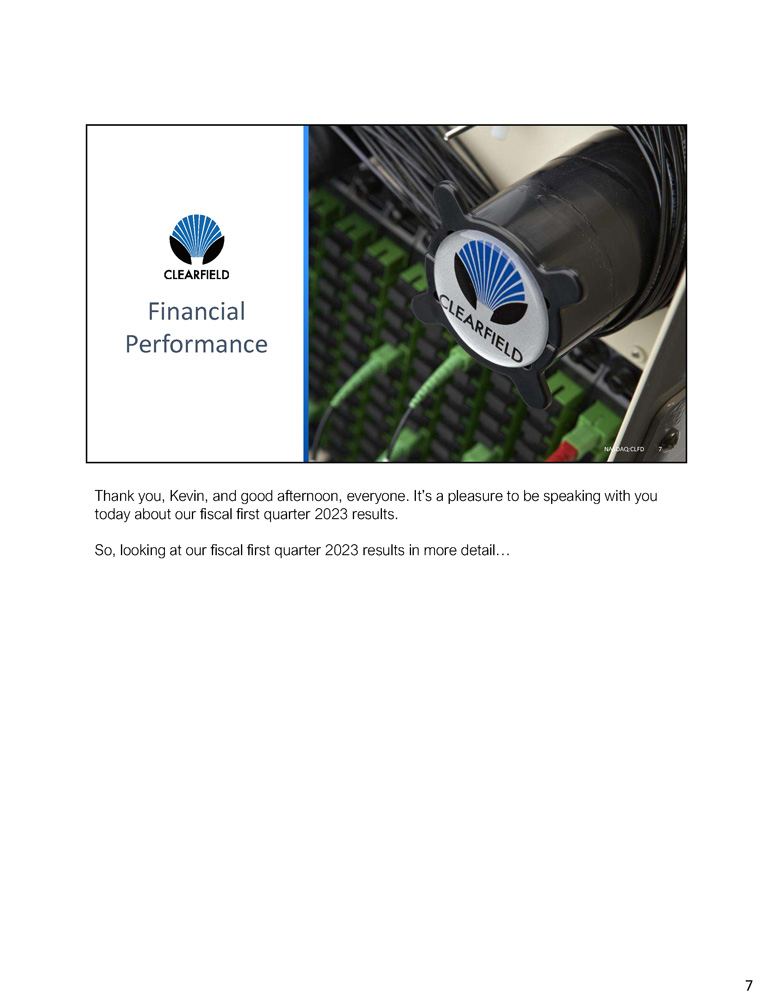 Fiber deployment is projected to be strong for the next decade 11.3M Ten Year Annual Average Run Rate Assumes 12.3 New Housing Units Homes With Fiber Availability: 92% Homes with 2+ Fiber Availability: 34% Next 10 - Years Source: Fiber Broadband Association / RVA, December 2022 Assumes 12.3M New Housing Units Homes with Fiber Availability: 92% Homes with 2+ Fiber Availability: 34% For some additional insights on what we’re seeing in the market and the significant long - term growth runway for fiber deployments, I’d like to welcome our Chief Marketing Officer, Kevin Morgan, to the call. Kevin? Thank you, Cheri. It’s great to be joining all of you this afternoon. The appetite for high - speed broadband communications has never been greater and shows no sign of letting up. This continues to drive fiber deployments deeper into every corner of society and across all market segments. As Cheri mentioned, we believe our work to maintain our world - class lead times and further progress our LEAP strategic plan enhances our position for the robust near - term demand environment. On slide 6, we have also included the Fiber Broadband Association’s strong forecast for fiber deployments over the next decade. In its 2022 Fiber Provider Survey, published in December, the Fiber Broadband Association estimated a 10 - year annual average run rate of 11.3 million fiber deployments. In 2022 alone, fiber providers passed 7.9 million additional homes, representing a new record for annual deployment. This momentum gives us a powerful foundation for 2023 and the years ahead. As you’ll see in the accompanying chart, we’re positioned within an accelerating investment cycle that has yet to reach its peak. We continue to view the gradual disbursement of ARPA and RDOF funds — and the upcoming distribution of BEAD funding – as meaningful, but gradual industry tailwinds that further expand our market opportunity. The data indicated on this slide, assumes that 12.3 million new housing units will come online over the next 10 years. Further, 92% of homes are expected to have fiber availability, with an additional 34% of homes having two or more available fiber connections. As this market continues to expand, we believe our craft - friendly products will continue to play a vital role in translating Homes Passed numbers into Homes Connected revenue for our service providers as they deepen their fiber deployments. Turning back to Clearfield’s fiscal first quarter performance, I’d now like to pass the call over to our CFO, Dan Herzog, who will walk us through our financial results for the fiscal first quarter of 2023. 6