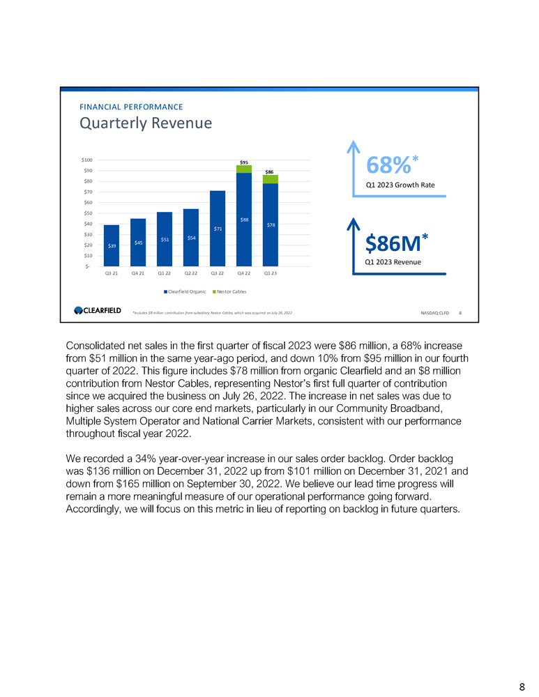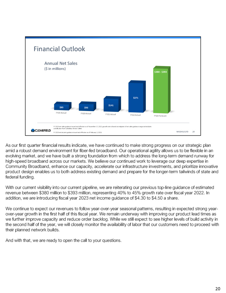 NASDAQ:CLFD 3 Introduction & Highlights Good afternoon, everyone, and thank you for joining us today. It is a pleasure to speak with our new and returning investors and analysts this afternoon to share Clearfield’s results for the first quarter of fiscal 2023, as well as provide an update on our business and current market trends. Our strong financial performance in the first quarter of fiscal 2023 reflects our ongoing execution on our strategic growth plan, as well as the robust and sustained demand for high - speed broadband. Total net sales for the first quarter were $86 million, which includes an $8 million contribution from Nestor Cables. Our organic net sales growth continues to be driven by our leadership in community broadband and expansion across each of our core end markets. As we continue to execute on our LEAP strategic plan, we aim to strengthen our existing competitive advantages as we build the scale necessary to serve the long - term demand runway for high - speed broadband in unserved and underserved communities nationwide. Based upon consideration of the expected investments and impact of our progress on our LEAP strategic plan as well as our ability to manage countervailing headwinds that could develop in customer ordering patterns and component sourcing, we are reiterating our previously stated revenue guidance for fiscal year 2023. In addition, we are introducing 2023 net income guidance of $4.30 to $4.50 a share. 3