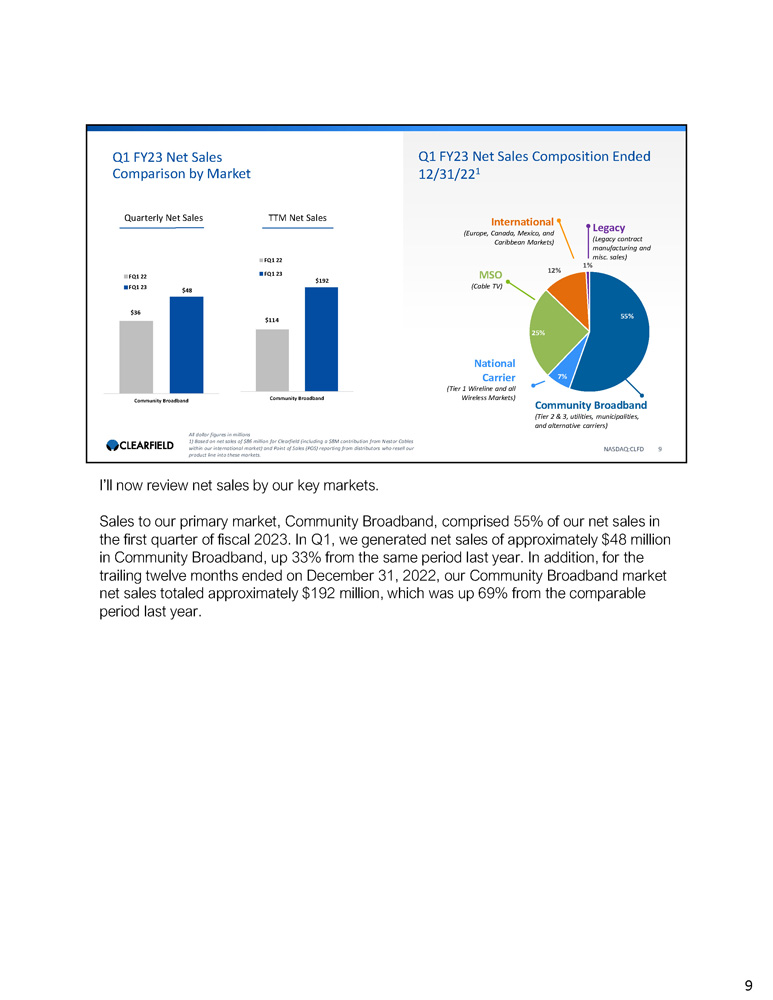 $39 $45 $51 $54 $71 $88 $78 $10 $ - $20 $30 $40 $70 $60 $50 $80 $90 $100 FINANCIAL PERFORMANCE Quarterly Revenue 68% * Q1 2023 Growth Rate $86M * Q1 2023 Revenue NASDAQ:CLFD 8 Q3 21 Q4 21 Q1 22 Q2 22 Q3 22 Q4 22 Q1 23 Clearfield Organic Nestor Cables *Includes $8 million contribution from subsidiary Nestor Cables, which was acquired on July 26, 2022 $95 $86 Consolidated net sales in the first quarter of fiscal 2023 were $86 million, a 68% increase from $51 million in the same year - ago period, and down 10% from $95 million in our fourth quarter of 2022. This figure includes $78 million from organic Clearfield and an $8 million contribution from Nestor Cables, representing Nestor’s first full quarter of contribution since we acquired the business on July 26, 2022. The increase in net sales was due to higher sales across our core end markets, particularly in our Community Broadband, Multiple System Operator and National Carrier Markets, consistent with our performance throughout fiscal year 2022. We recorded a 34% year - over - year increase in our sales order backlog. Order backlog was $136 million on December 31, 2022 up from $101 million on December 31, 2021 and down from $165 million on September 30, 2022. We believe our lead time progress will remain a more meaningful measure of our operational performance going forward. Accordingly, we will focus on this metric in lieu of reporting on backlog in future quarters. 8