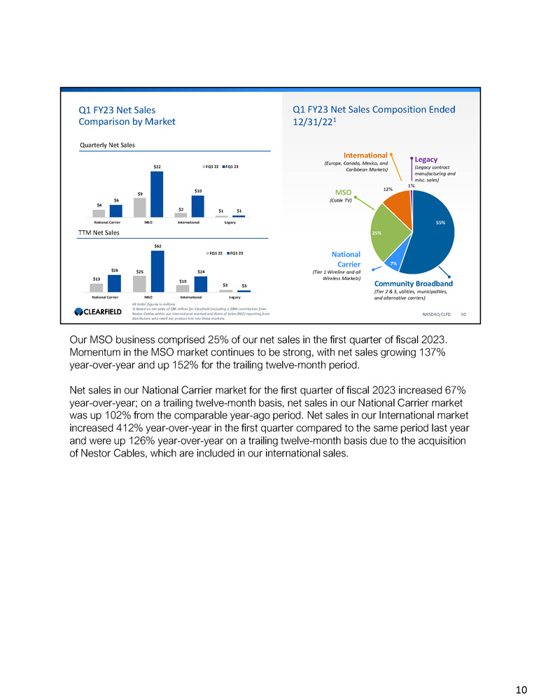 Q1 FY23 Net Sales Comparison by Market All dollar figures in millions 1 ) Based on net sales of $ 86 million for Clearfield (including a $ 8 M contribution from Nestor Cables within our international market) and Point of Sales (POS) reporting from distributors who resell our product line into these markets . Q1 FY23 Net Sales Composition Ended 12/31/22 1 Legacy (Legacy contract manufacturing and misc. sales) 55% 7% 25% 12% 1% $114 $192 Community Broadband FQ1 22 FQ1 23 Quarterly Net Sales TTM Net Sales Community Broadband (Tier 2 & 3, utilities, municipalities, and alternative carriers) National Carrier (Tier 1 Wireline and all Wireless Markets) MSO (Cable TV) International (Europe, Canada, Mexico, and Caribbean Markets) NASDAQ:CLFD 9 $36 $48 Community Broadband FQ1 22 FQ1 23 I’ll now review net sales by our key markets. Sales to our primary market, Community Broadband, comprised 55% of our net sales in the first quarter of fiscal 2023. In Q1, we generated net sales of approximately $48 million in Community Broadband, up 33% from the same period last year. In addition, for the trailing twelve months ended on December 31, 2022, our Community Broadband market net sales totaled approximately $192 million, which was up 69% from the comparable period last year. 9