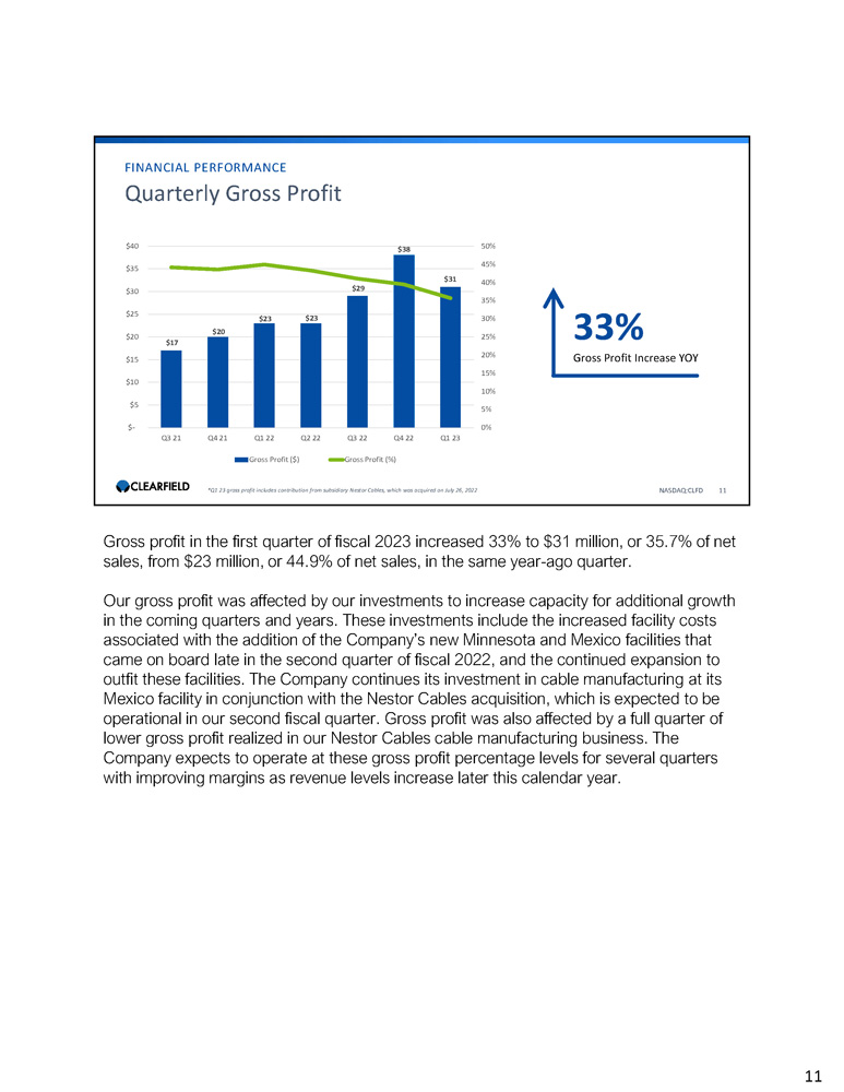 $13 $25 $10 $3 $26 $62 $24 $3 National Carrier FQ1 22 FQ1 23 NASDAQ:CLFD 10 MSO International Legacy All dollar figures in millions 1) Based on net sales of $86 million for Clearfield (including a $8M contribution from Nestor Cables within our international market) and Point of Sales (POS) reporting from distributors who resell our product line into these markets. Q1 FY23 Net Sales Composition Ended 12/31/22 1 Legacy (Legacy contract manufacturing and misc. sales) Community Broadband (Tier 2 & 3, utilities, municipalities, and alternative carriers) International (Europe, Canada, Mexico, and Caribbean Markets) MSO (Cable TV) National Carrier (Tier 1 Wireline and all Wireless Markets) $4 $9 $2 $6 $22 $10 $1 $1 National Carrier MSO International Legacy FQ1 22 FQ1 23 Q1 FY23 Net Sales Comparison by Market Quarterly Net Sales TTM Net Sales 55% 7% 25% 12% 1% Our MSO business comprised 25 % of our net sales in the first quarter of fiscal 2023 . Momentum in the MSO market continues to be strong, with net sales growing 137 % year - over - year and up 152 % for the trailing twelve - month period . Net sales in our National Carrier market for the first quarter of fiscal 2023 increased 67% year - over - year; on a trailing twelve - month basis, net sales in our National Carrier market was up 102% from the comparable year - ago period. Net sales in our International market increased 412% year - over - year in the first quarter compared to the same period last year and were up 126% year - over - year on a trailing twelve - month basis due to the acquisition of Nestor Cables, which are included in our international sales. 10