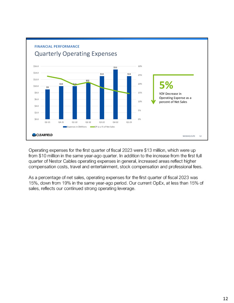$17 $20 $23 $23 $29 $38 $31 0% 5% 10% 15% 20% 25% 30% 35% 40% 45% 50% $ - $5 $10 $15 $20 $25 $30 $35 $40 Q3 21 Q4 21 Q1 22 Q2 22 Q3 22 Q4 22 Q1 23 Gross Profit ($) Gross Profit (%) FINANCIAL PERFORMANCE Quarterly Gross Profit 33% Gross Profit Increase YOY NASDAQ:CLFD 11 *Q1 23 gross profit includes contribution from subsidiary Nestor Cables, which was acquired on July 26, 2022 Gross profit in the first quarter of fiscal 2023 increased 33% to $31 million, or 35.7% of net sales, from $23 million, or 44.9% of net sales, in the same year - ago quarter. Our gross profit was affected by our investments to increase capacity for additional growth in the coming quarters and years. These investments include the increased facility costs associated with the addition of the Company’s new Minnesota and Mexico facilities that came on board late in the second quarter of fiscal 2022, and the continued expansion to outfit these facilities. The Company continues its investment in cable manufacturing at its Mexico facility in conjunction with the Nestor Cables acquisition, which is expected to be operational in our second fiscal quarter. Gross profit was also affected by a full quarter of lower gross profit realized in our Nestor Cables cable manufacturing business. The Company expects to operate at these gross profit percentage levels for several quarters with improving margins as revenue levels increase later this calendar year. 11