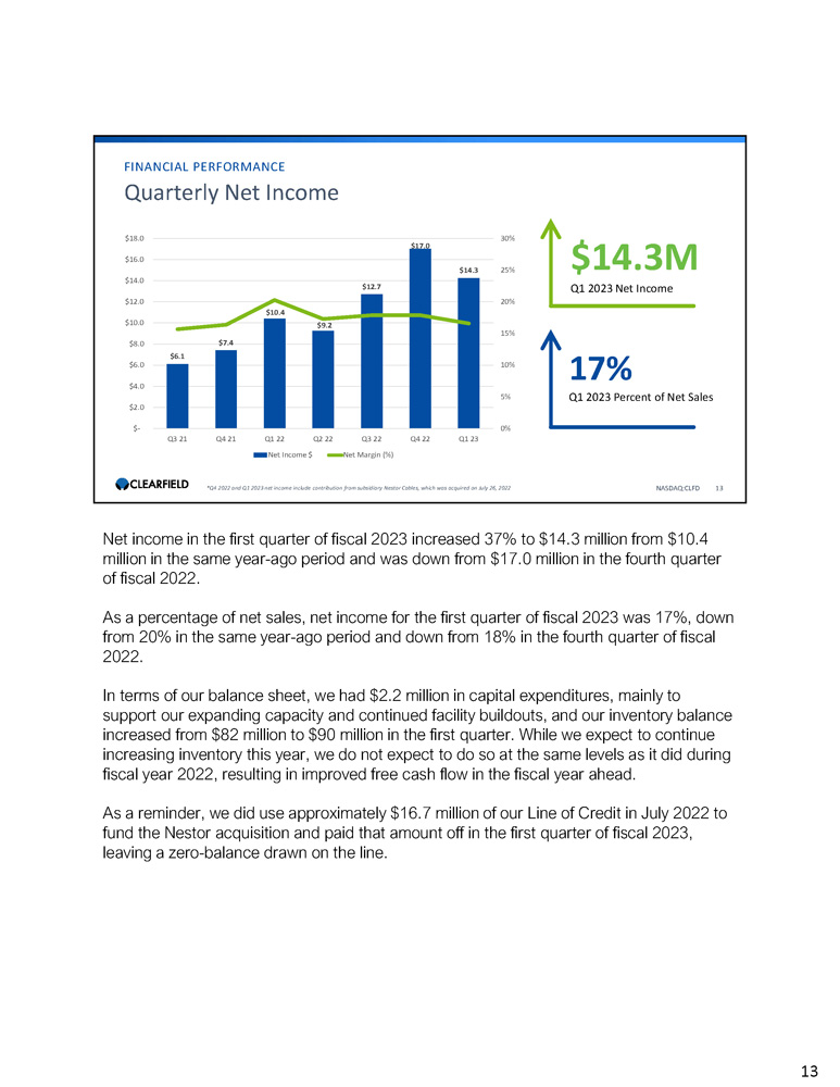 $9 $10 $10 $13 $15 $13 0% 5% 10% 15% 20% 25% 30% $2.0 $0.0 $4.0 $6.0 $8.0 $10.0 $12.0 $14.0 $16.0 Q3 21 Q4 21 Q1 22 Q2 22 Q3 22 Q4 22 Q1 23 Expenses in $Millions OP as a % of Net Sales $ 11 5% YOY Decrease in Operating Expense as a percent of Net Sales NASDAQ:CLFD 12 FINANCIAL PERFORMANCE Quarterly Operating Expenses Operating expenses for the first quarter of fiscal 2023 were $13 million, which were up from $10 million in the same year - ago quarter. In addition to the increase from the first full quarter of Nestor Cables operating expenses in general, increased areas reflect higher compensation costs, travel and entertainment, stock compensation and professional fees. As a percentage of net sales, operating expenses for the first quarter of fiscal 2023 was 15%, down from 19% in the same year - ago period. Our current OpEx, at less than 15% of sales, reflects our continued strong operating leverage. 12