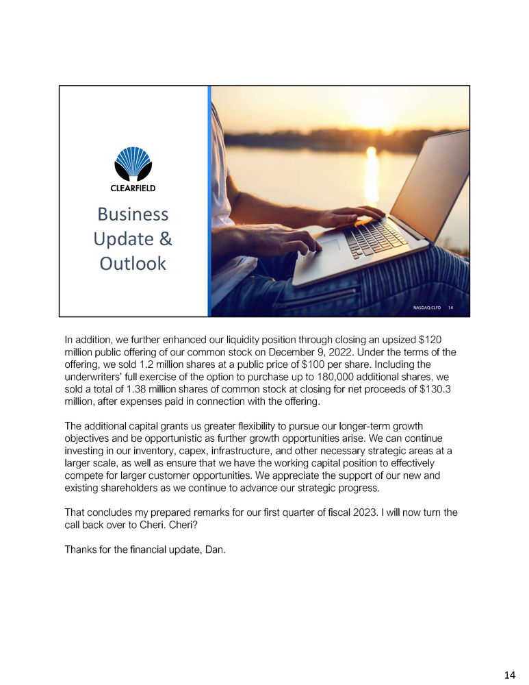 NASDAQ:CLFD 14 Business Update & Outlook In addition, we further enhanced our liquidity position through closing an upsized $120 million public offering of our common stock on December 9, 2022. Under the terms of the offering, we sold 1.2 million shares at a public price of $100 per share. Including the underwriters’ full exercise of the option to purchase up to 180,000 additional shares, we sold a total of 1.38 million shares of common stock at closing for net proceeds of $130.3 million, after expenses paid in connection with the offering. The additional capital grants us greater flexibility to pursue our longer - term growth objectives and be opportunistic as further growth opportunities arise. We can continue investing in our inventory, capex, infrastructure, and other necessary strategic areas at a larger scale, as well as ensure that we have the working capital position to effectively compete for larger customer opportunities. We appreciate the support of our new and existing shareholders as we continue to advance our strategic progress. That concludes my prepared remarks for our first quarter of fiscal 2023. I will now turn the call back over to Cheri. Cheri? Thanks for the financial update, Dan. 14