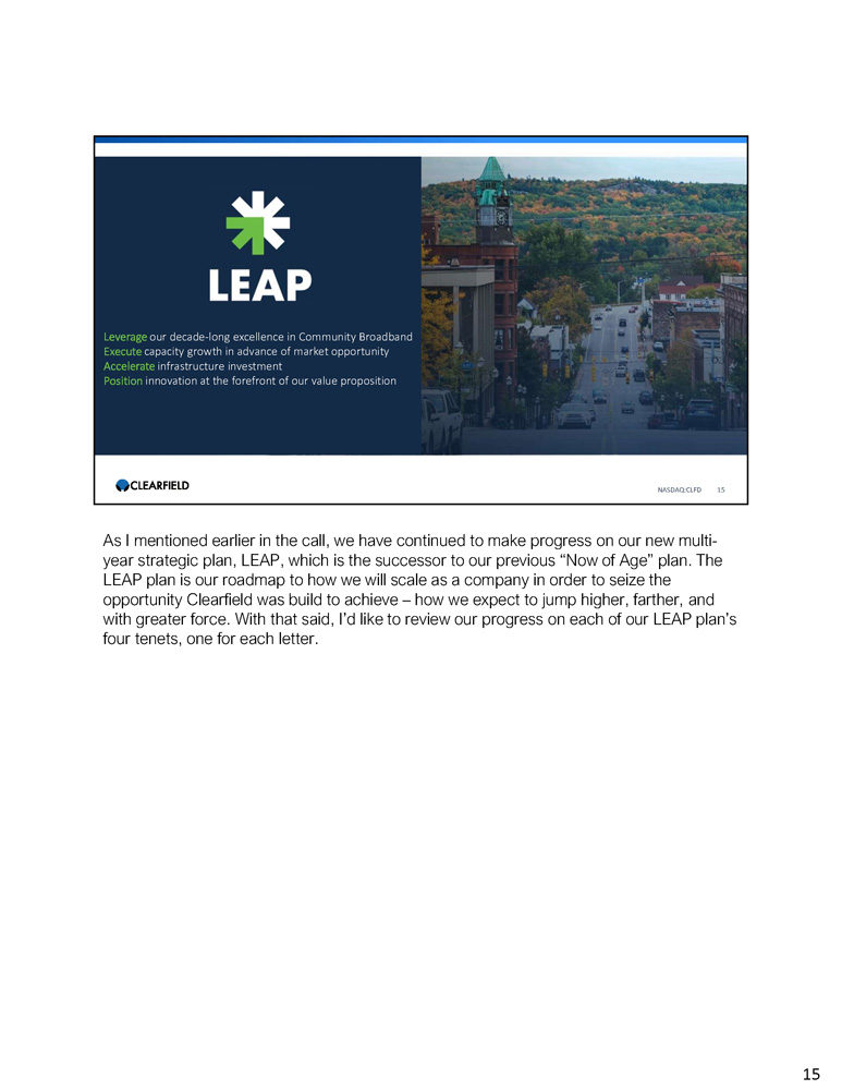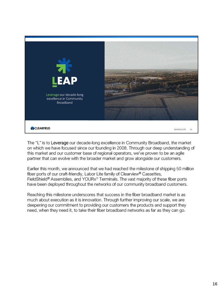 Leverage our decade - long excellence in Community Broadband Execute capacity growth in advance of market opportunity Accelerate infrastructure investment Position innovation at the forefront of our value proposition NASDAQ:CLFD 15 15 As I mentioned earlier in the call, we have continued to make progress on our new multi - year strategic plan, LEAP, which is the successor to our previous “Now of Age” plan. The LEAP plan is our roadmap to how we will scale as a company in order to seize the opportunity Clearfield was build to achieve – how we expect to jump higher, farther, and with greater force. With that said, I’d like to review our progress on each of our LEAP plan’s four tenets, one for each letter.