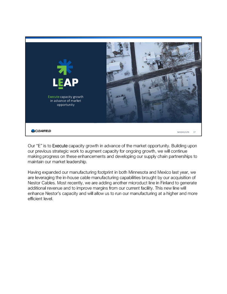 Leverage our decade - long excellence in Community Broadband NASDAQ:CLFD 16 16 The “L” is to Leverage our decade - long excellence in Community Broadband, the market on which we have focused since our founding in 2008. Through our deep understanding of this market and our customer base of regional operators, we’ve proven to be an agile partner that can evolve with the broader market and grow alongside our customers. Earlier this month, we announced that we had reached the milestone of shipping 50 million fiber ports of our craft - friendly, Labor Lite family of Clearview ® Cassettes, FieldShield ® Assemblies, and YOURx ® Terminals. The vast majority of these fiber ports have been deployed throughout the networks of our community broadband customers. Reaching this milestone underscores that success in the fiber broadband market is as much about execution as it is innovation . Through further improving our scale, we are deepening our commitment to providing our customers the products and support they need, when they need it, to take their fiber broadband networks as far as they can go .