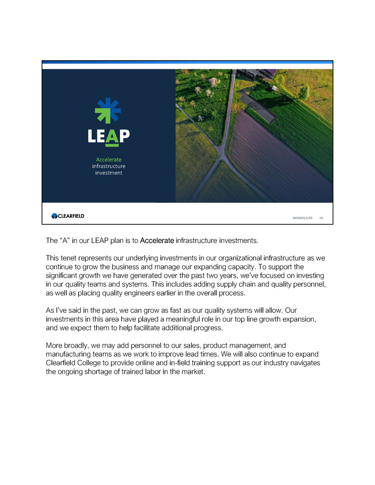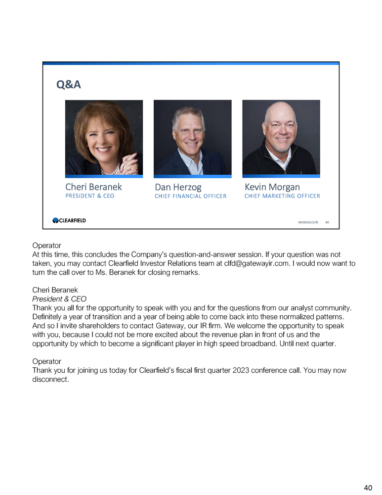 Cheri Beranek PRESIDENT & CEO Dan Herzog CHIEF FINANCIAL OFFICER Q&A NASDAQ:CLFD 40 Kevin Morgan CHIEF MARKETING OFFICER Operator At this time, this concludes the Company’s question - and - answer session. If your question was not taken, you may contact Clearfield Investor Relations team at clfd@gatewayir.com. I would now want to turn the call over to Ms. Beranek for closing remarks. Cheri Beranek President & CEO Thank you all for the opportunity to speak with you and for the questions from our analyst community. Definitely a year of transition and a year of being able to come back into these normalized patterns. And so I invite shareholders to contact Gateway, our IR firm. We welcome the opportunity to speak with you, because I could not be more excited about the revenue plan in front of us and the opportunity by which to become a significant player in high speed broadband. Until next quarter. Operator Thank you for joining us today for Clearfield’s fiscal first quarter 2023 conference call. You may now disconnect. 40