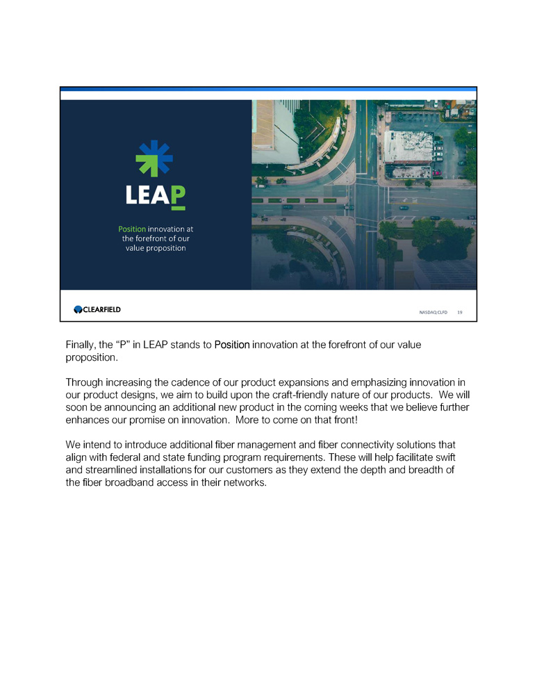Position innovation at the forefront of our value proposition NASDAQ:CLFD 19 Finally, the “P” in LEAP stands to Position innovation at the forefront of our value proposition. Through increasing the cadence of our product expansions and emphasizing innovation in our product designs, we aim to build upon the craft - friendly nature of our products. We will soon be announcing an additional new product in the coming weeks that we believe further enhances our promise on innovation. More to come on that front! We intend to introduce additional fiber management and fiber connectivity solutions that align with federal and state funding program requirements . These will help facilitate swift and streamlined installations for our customers as they extend the depth and breadth of the fiber broadband access in their networks .