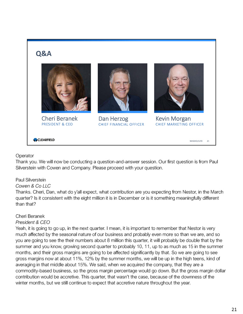 Cheri Beranek PRESIDENT & CEO Dan Herzog CHIEF FINANCIAL OFFICER Q&A NASDAQ:CLFD 21 Kevin Morgan CHIEF MARKETING OFFICER Operator Thank you. We will now be conducting a question - and - answer session. Our first question is from Paul Silverstein with Cowen and Company. Please proceed with your question. Paul Silverstein Cowen & Co LLC Thanks. Cheri, Dan, what do y’all expect, what contribution are you expecting from Nestor, in the March quarter? Is it consistent with the eight million it is in December or is it something meaningfully different than that? Cheri Beranek President & CEO Yeah, it is going to go up, in the next quarter. I mean, it is important to remember that Nestor is very much affected by the seasonal nature of our business and probably even more so than we are, and so you are going to see the their numbers about 8 million this quarter, it will probably be double that by the summer and you know, growing second quarter to probably 10, 11, up to as much as 15 in the summer months, and their gross margins are going to be affected significantly by that. So we are going to see gross margins now at about 11%, 12% by the summer months, we will be up in the high teens, kind of averaging in that middle about 15%. We said, when we acquired the company, that they are a commodity - based business, so the gross margin percentage would go down. But the gross margin dollar contribution would be accretive. This quarter, that wasn’t the case, because of the downness of the winter months, but we still continue to expect that accretive nature throughout the year. 21