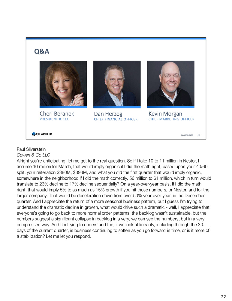 Cheri Beranek PRESIDENT & CEO Dan Herzog CHIEF FINANCIAL OFFICER Q&A NASDAQ:CLFD 22 Kevin Morgan CHIEF MARKETING OFFICER Paul Silverstein Cowen & Co LLC Alright you’re anticipating, let me get to the real question. So if I take 10 to 11 million in Nestor, I assume 10 million for March, that would imply organic if I did the math right, based upon your 40/60 split, your reiteration $380M, $393M, and what you did the first quarter that would imply organic, somewhere in the neighborhood if I did the math correctly, 56 million to 61 million, which in turn would translate to 23% decline to 17% decline sequentially? On a year - over - year basis, if I did the math right, that would imply 5% to as much as 15% growth if you hit those numbers, or Nestor, and for the larger company. That would be deceleration down from over 50% year - over - year, in the December quarter. And I appreciate the return of a more seasonal business pattern, but I guess I’m trying to understand the dramatic decline in growth, what would drive such a dramatic - well, I appreciate that everyone’s going to go back to more normal order patterns, the backlog wasn’t sustainable, but the numbers suggest a significant collapse in backlog in a very, we can see the numbers, but in a very compressed way. And I’m trying to understand the, if we look at linearity, including through the 30 - days of the current quarter, is business continuing to soften as you go forward in time, or is it more of a stabilization? Let me let you respond. 22