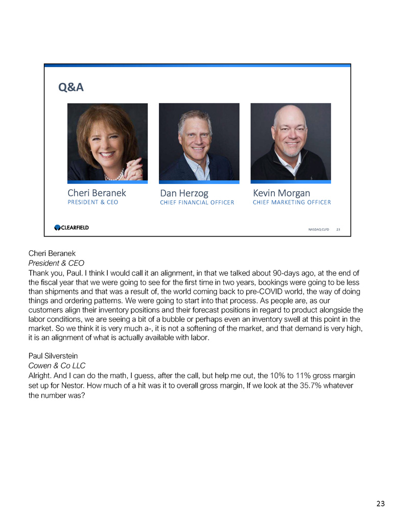Cheri Beranek PRESIDENT & CEO Dan Herzog CHIEF FINANCIAL OFFICER Q&A NASDAQ:CLFD 23 Kevin Morgan CHIEF MARKETING OFFICER Cheri Beranek President & CEO Thank you, Paul. I think I would call it an alignment, in that we talked about 90 - days ago, at the end of the fiscal year that we were going to see for the first time in two years, bookings were going to be less than shipments and that was a result of, the world coming back to pre - COVID world, the way of doing things and ordering patterns. We were going to start into that process. As people are, as our customers align their inventory positions and their forecast positions in regard to product alongside the labor conditions, we are seeing a bit of a bubble or perhaps even an inventory swell at this point in the market. So we think it is very much a - , it is not a softening of the market, and that demand is very high, it is an alignment of what is actually available with labor. Paul Silverstein Cowen & Co LLC Alright . And I can do the math, I guess, after the call, but help me out, the 10 % to 11 % gross margin set up for Nestor . How much of a hit was it to overall gross margin, If we look at the 35 . 7 % whatever the number was? 23