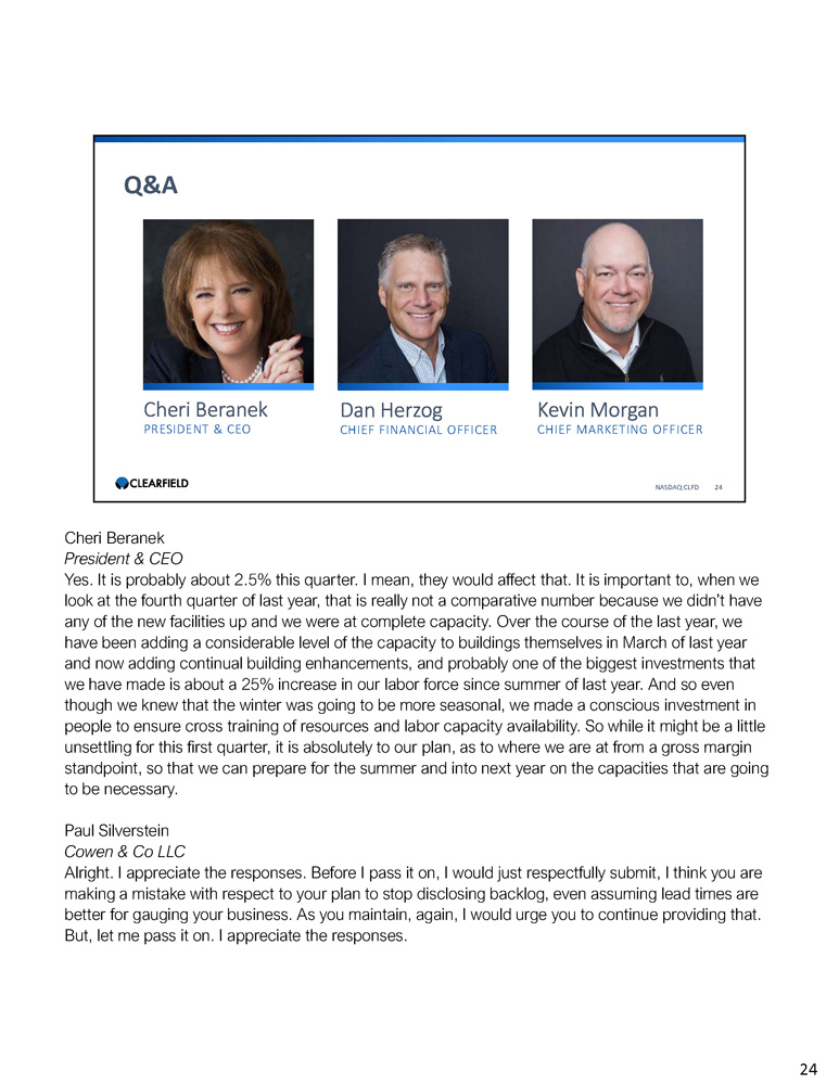 Cheri Beranek PRESIDENT & CEO Dan Herzog CHIEF FINANCIAL OFFICER Q&A NASDAQ:CLFD 24 Kevin Morgan CHIEF MARKETING OFFICER Cheri Beranek President & CEO Yes. It is probably about 2.5% this quarter. I mean, they would affect that. It is important to, when we look at the fourth quarter of last year, that is really not a comparative number because we didn’t have any of the new facilities up and we were at complete capacity. Over the course of the last year, we have been adding a considerable level of the capacity to buildings themselves in March of last year and now adding continual building enhancements, and probably one of the biggest investments that we have made is about a 25% increase in our labor force since summer of last year. And so even though we knew that the winter was going to be more seasonal, we made a conscious investment in people to ensure cross training of resources and labor capacity availability. So while it might be a little unsettling for this first quarter, it is absolutely to our plan, as to where we are at from a gross margin standpoint, so that we can prepare for the summer and into next year on the capacities that are going to be necessary. Paul Silverstein Cowen & Co LLC Alright . I appreciate the responses . Before I pass it on, I would just respectfully submit, I think you are making a mistake with respect to your plan to stop disclosing backlog, even assuming lead times are better for gauging your business . As you maintain, again, I would urge you to continue providing that . But, let me pass it on . I appreciate the responses . 24