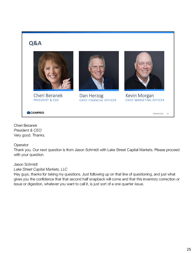 Cheri Beranek PRESIDENT & CEO Dan Herzog CHIEF FINANCIAL OFFICER Q&A NASDAQ:CLFD 25 Kevin Morgan CHIEF MARKETING OFFICER Cheri Beranek President & CEO Very good. Thanks. Operator Thank you. Our next question is from Jason Schmidt with Lake Street Capital Markets. Please proceed with your question. Jason Schmidt Lake Street Capital Markets, LLC Hey guys, thanks for taking my questions. Just following up on that line of questioning, and just what gives you the confidence that that second half snapback will come and that this inventory correction or issue or digestion, whatever you want to call it, is just sort of a one quarter issue. 25
