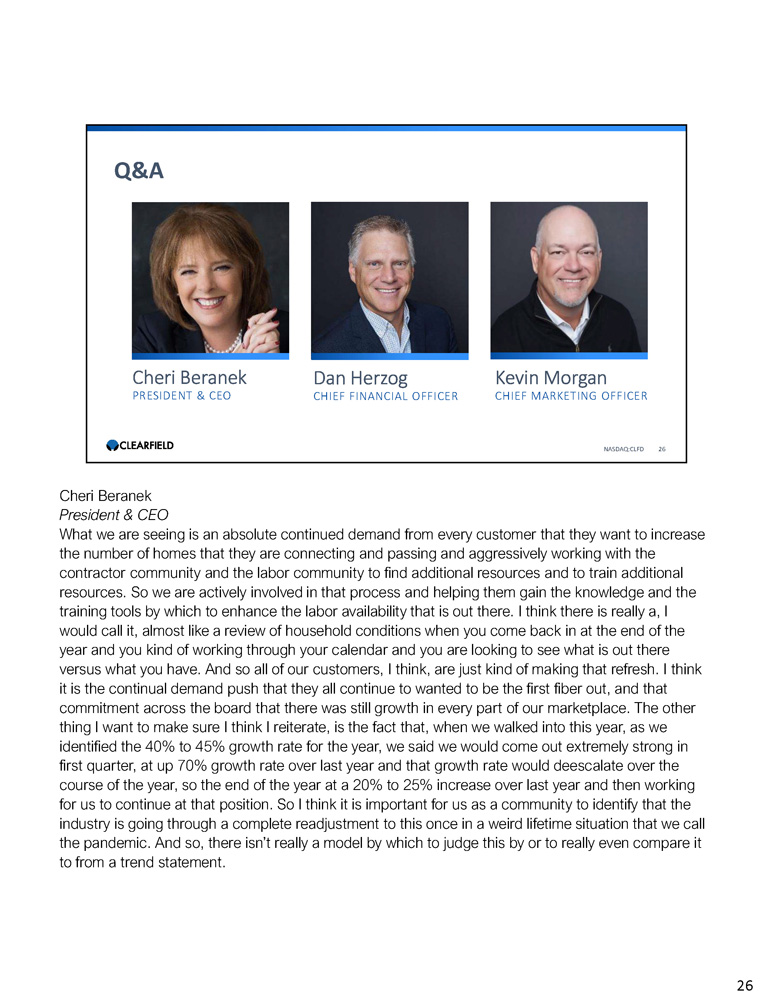 Cheri Beranek PRESIDENT & CEO Dan Herzog CHIEF FINANCIAL OFFICER Q&A NASDAQ:CLFD 26 Kevin Morgan CHIEF MARKETING OFFICER Cheri Beranek President & CEO What we are seeing is an absolute continued demand from every customer that they want to increase the number of homes that they are connecting and passing and aggressively working with the contractor community and the labor community to find additional resources and to train additional resources. So we are actively involved in that process and helping them gain the knowledge and the training tools by which to enhance the labor availability that is out there. I think there is really a, I would call it, almost like a review of household conditions when you come back in at the end of the year and you kind of working through your calendar and you are looking to see what is out there versus what you have. And so all of our customers, I think, are just kind of making that refresh. I think it is the continual demand push that they all continue to wanted to be the first fiber out, and that commitment across the board that there was still growth in every part of our marketplace. The other thing I want to make sure I think I reiterate, is the fact that, when we walked into this year, as we identified the 40% to 45% growth rate for the year, we said we would come out extremely strong in first quarter, at up 70% growth rate over last year and that growth rate would deescalate over the course of the year, so the end of the year at a 20% to 25% increase over last year and then working for us to continue at that position. So I think it is important for us as a community to identify that the industry is going through a complete readjustment to this once in a weird lifetime situation that we call the pandemic. And so, there isn’t really a model by which to judge this by or to really even compare it to from a trend statement. 26