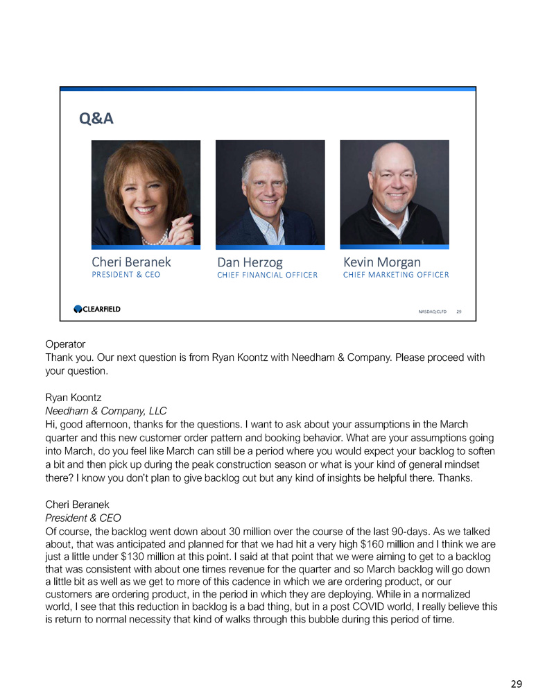 Cheri Beranek PRESIDENT & CEO Dan Herzog CHIEF FINANCIAL OFFICER Q&A NASDAQ:CLFD 29 Kevin Morgan CHIEF MARKETING OFFICER Operator Thank you. Our next question is from Ryan Koontz with Needham & Company. Please proceed with your question. Ryan Koontz Needham & Company, LLC Hi, good afternoon, thanks for the questions. I want to ask about your assumptions in the March quarter and this new customer order pattern and booking behavior. What are your assumptions going into March, do you feel like March can still be a period where you would expect your backlog to soften a bit and then pick up during the peak construction season or what is your kind of general mindset there? I know you don’t plan to give backlog out but any kind of insights be helpful there. Thanks. Cheri Beranek President & CEO Of course, the backlog went down about 30 million over the course of the last 90 - days. As we talked about, that was anticipated and planned for that we had hit a very high $160 million and I think we are just a little under $130 million at this point. I said at that point that we were aiming to get to a backlog that was consistent with about one times revenue for the quarter and so March backlog will go down a little bit as well as we get to more of this cadence in which we are ordering product, or our customers are ordering product, in the period in which they are deploying. While in a normalized world, I see that this reduction in backlog is a bad thing, but in a post COVID world, I really believe this is return to normal necessity that kind of walks through this bubble during this period of time. 29