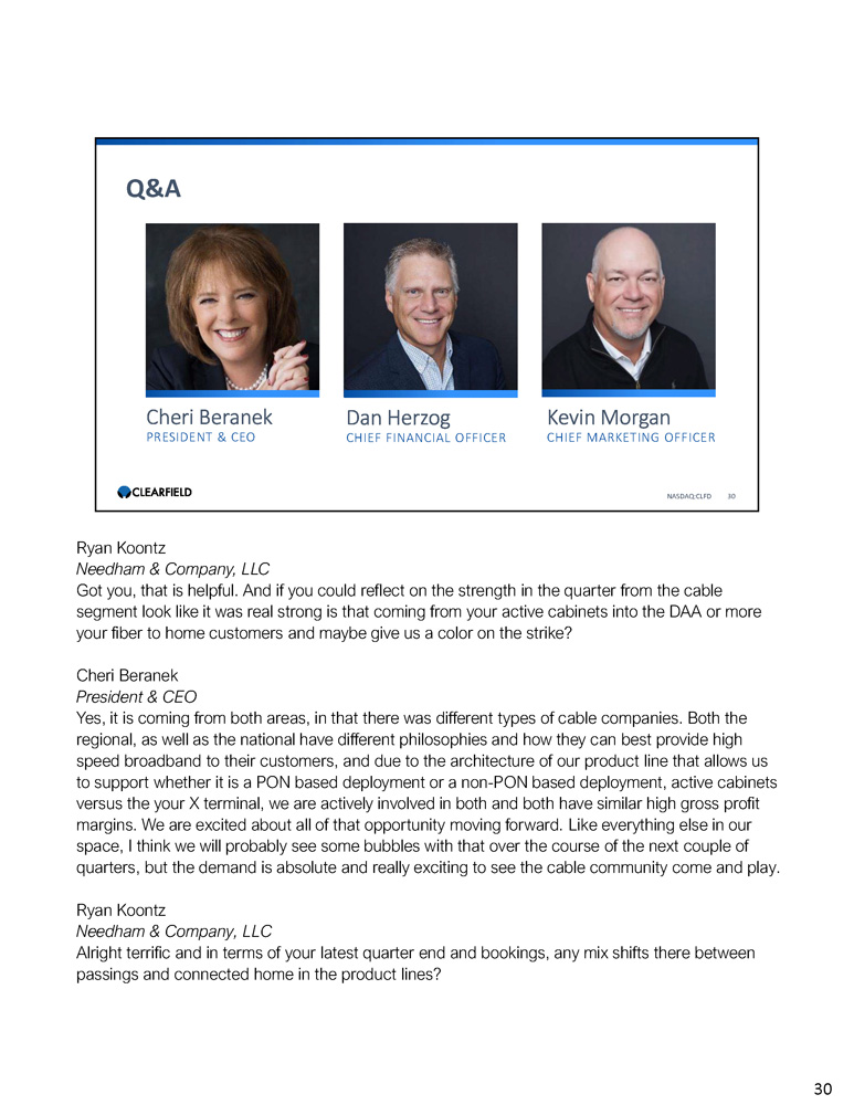 Cheri Beranek PRESIDENT & CEO Dan Herzog CHIEF FINANCIAL OFFICER Q&A NASDAQ:CLFD 30 Kevin Morgan CHIEF MARKETING OFFICER Ryan Koontz Needham & Company, LLC Got you, that is helpful. And if you could reflect on the strength in the quarter from the cable segment look like it was real strong is that coming from your active cabinets into the DAA or more your fiber to home customers and maybe give us a color on the strike? Cheri Beranek President & CEO Yes, it is coming from both areas, in that there was different types of cable companies. Both the regional, as well as the national have different philosophies and how they can best provide high speed broadband to their customers, and due to the architecture of our product line that allows us to support whether it is a PON based deployment or a non - PON based deployment, active cabinets versus the your X terminal, we are actively involved in both and both have similar high gross profit margins. We are excited about all of that opportunity moving forward. Like everything else in our space, I think we will probably see some bubbles with that over the course of the next couple of quarters, but the demand is absolute and really exciting to see the cable community come and play. Ryan Koontz Needham & Company, LLC Alright terrific and in terms of your latest quarter end and bookings, any mix shifts there between passings and connected home in the product lines? 30