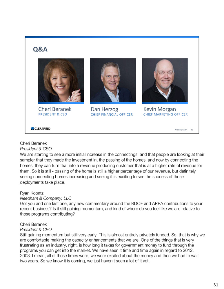 Cheri Beranek PRESIDENT & CEO Dan Herzog CHIEF FINANCIAL OFFICER Q&A NASDAQ:CLFD 31 Kevin Morgan CHIEF MARKETING OFFICER Cheri Beranek President & CEO We are starting to see a more initial increase in the connectings, and that people are looking at their sampler that they made the investment in, the passing of the homes, and now by connecting the homes, they can turn that into a revenue producing customer that is at a higher rate of revenue for them. So it is still - passing of the home is still a higher percentage of our revenue, but definitely seeing connecting homes increasing and seeing it is exciting to see the success of those deployments take place. Ryan Koontz Needham & Company, LLC Got you and one last one, any new commentary around the RDOF and ARPA contributions to your recent business? Is it still gaining momentum, and kind of where do you feel like we are relative to those programs contributing? Cheri Beranek President & CEO Still gaining momentum but still very early. This is almost entirely privately funded. So, that is why we are comfortable making the capacity enhancements that we are. One of the things that is very frustrating as an industry, right, is how long it takes for government money to fund through the programs you can get into the market. We have seen it time and time again in regard to 2012, 2008. I mean, all of those times were, we were excited about the money and then we had to wait two years. So we know it is coming, we just haven’t seen a lot of it yet. 31