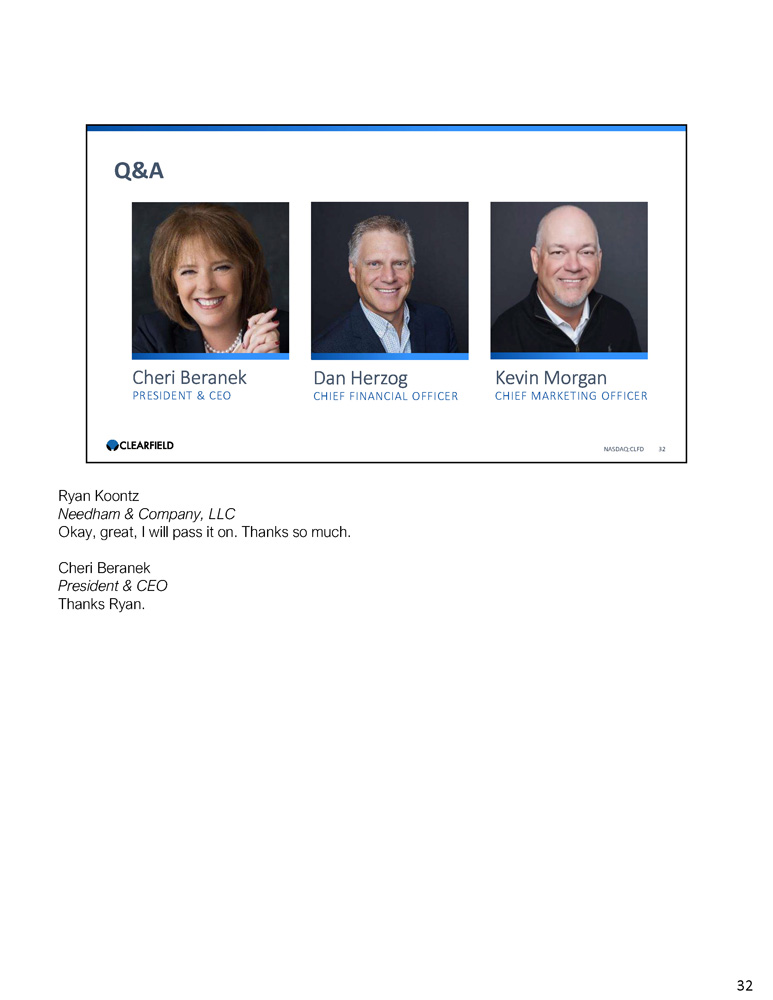 Cheri Beranek PRESIDENT & CEO Dan Herzog CHIEF FINANCIAL OFFICER Q&A NASDAQ:CLFD 32 Kevin Morgan CHIEF MARKETING OFFICER Ryan Koontz Needham & Company, LLC Okay, great, I will pass it on. Thanks so much. Cheri Beranek President & CEO Thanks Ryan. 32