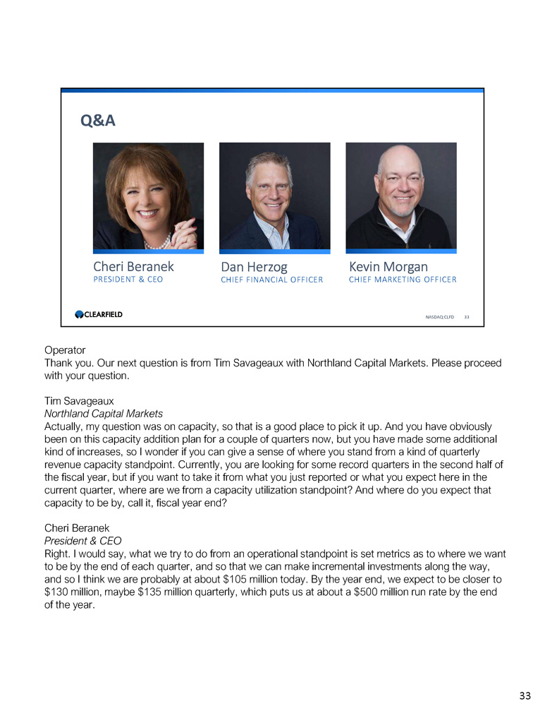 Cheri Beranek PRESIDENT & CEO Dan Herzog CHIEF FINANCIAL OFFICER Q&A NASDAQ:CLFD 33 Kevin Morgan CHIEF MARKETING OFFICER Operator Thank you. Our next question is from Tim Savageaux with Northland Capital Markets. Please proceed with your question. Tim Savageaux Northland Capital Markets Actually, my question was on capacity, so that is a good place to pick it up. And you have obviously been on this capacity addition plan for a couple of quarters now, but you have made some additional kind of increases, so I wonder if you can give a sense of where you stand from a kind of quarterly revenue capacity standpoint. Currently, you are looking for some record quarters in the second half of the fiscal year, but if you want to take it from what you just reported or what you expect here in the current quarter, where are we from a capacity utilization standpoint? And where do you expect that capacity to be by, call it, fiscal year end? Cheri Beranek President & CEO Right. I would say, what we try to do from an operational standpoint is set metrics as to where we want to be by the end of each quarter, and so that we can make incremental investments along the way, and so I think we are probably at about $105 million today. By the year end, we expect to be closer to $130 million, maybe $135 million quarterly, which puts us at about a $500 million run rate by the end of the year. 33