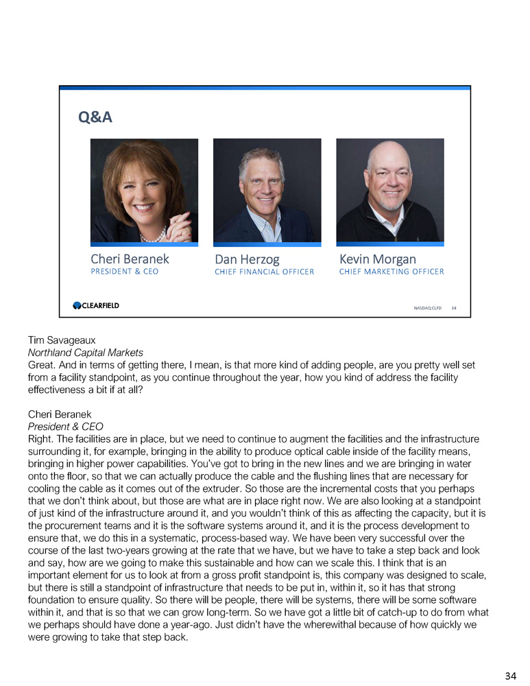 Cheri Beranek PRESIDENT & CEO Dan Herzog CHIEF FINANCIAL OFFICER Q&A NASDAQ:CLFD 34 Kevin Morgan CHIEF MARKETING OFFICER Tim Savageaux Northland Capital Markets Great. And in terms of getting there, I mean, is that more kind of adding people, are you pretty well set from a facility standpoint, as you continue throughout the year, how you kind of address the facility effectiveness a bit if at all? Cheri Beranek President & CEO Right. The facilities are in place, but we need to continue to augment the facilities and the infrastructure surrounding it, for example, bringing in the ability to produce optical cable inside of the facility means, bringing in higher power capabilities. You’ve got to bring in the new lines and we are bringing in water onto the floor, so that we can actually produce the cable and the flushing lines that are necessary for cooling the cable as it comes out of the extruder. So those are the incremental costs that you perhaps that we don’t think about, but those are what are in place right now. We are also looking at a standpoint of just kind of the infrastructure around it, and you wouldn’t think of this as affecting the capacity, but it is the procurement teams and it is the software systems around it, and it is the process development to ensure that, we do this in a systematic, process - based way. We have been very successful over the course of the last two - years growing at the rate that we have, but we have to take a step back and look and say, how are we going to make this sustainable and how can we scale this. I think that is an important element for us to look at from a gross profit standpoint is, this company was designed to scale, but there is still a standpoint of infrastructure that needs to be put in, within it, so it has that strong foundation to ensure quality. So there will be people, there will be systems, there will be some software within it, and that is so that we can grow long - term. So we have got a little bit of catch - up to do from what we perhaps should have done a year - ago. Just didn’t have the wherewithal because of how quickly we were growing to take that step back. 34