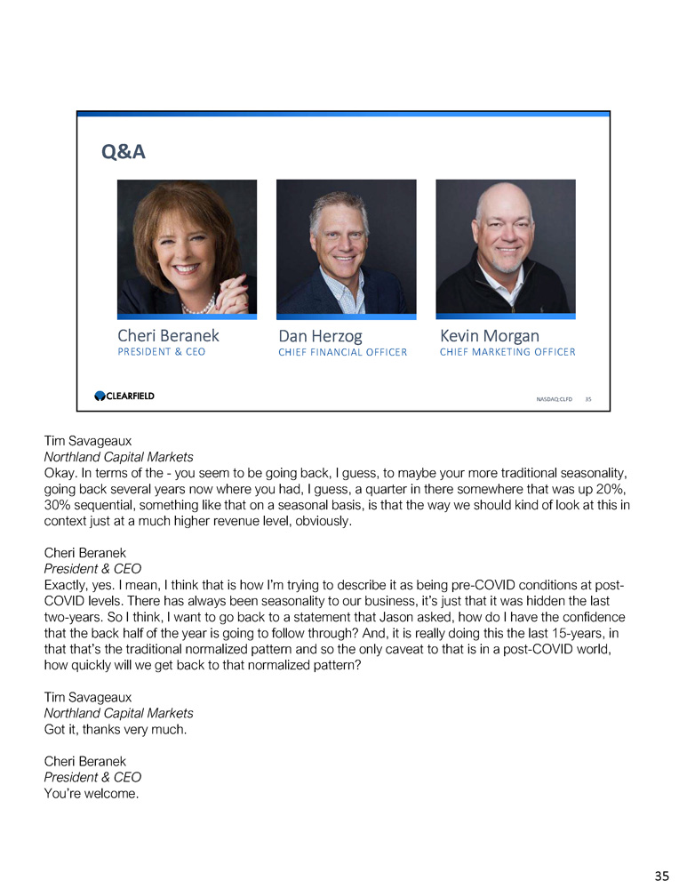 Cheri Beranek PRESIDENT & CEO Dan Herzog CHIEF FINANCIAL OFFICER Q&A NASDAQ:CLFD 35 Kevin Morgan CHIEF MARKETING OFFICER Tim Savageaux Northland Capital Markets Okay . In terms of the - you seem to be going back, I guess, to maybe your more traditional seasonality, going back several years now where you had, I guess, a quarter in there somewhere that was up 20 % , 30 % sequential, something like that on a seasonal basis, is that the way we should kind of look at this in context just at a much higher revenue level, obviously . Cheri Beranek President & CEO Exactly, yes. I mean, I think that is how I’m trying to describe it as being pre - COVID conditions at post - COVID levels. There has always been seasonality to our business, it’s just that it was hidden the last two - years. So I think, I want to go back to a statement that Jason asked, how do I have the confidence that the back half of the year is going to follow through? And, it is really doing this the last 15 - years, in that that’s the traditional normalized pattern and so the only caveat to that is in a post - COVID world, how quickly will we get back to that normalized pattern? Tim Savageaux Northland Capital Markets Got it, thanks very much. Cheri Beranek President & CEO You’re welcome. 35