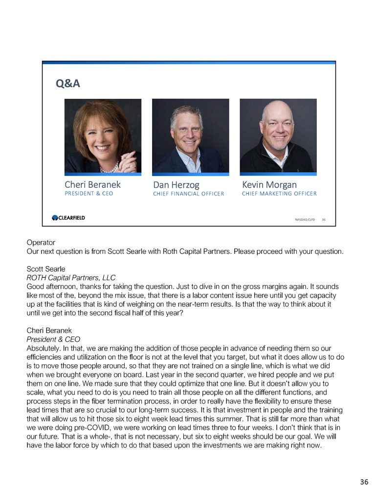Cheri Beranek PRESIDENT & CEO Dan Herzog CHIEF FINANCIAL OFFICER Q&A NASDAQ:CLFD 36 Kevin Morgan CHIEF MARKETING OFFICER Operator Our next question is from Scott Searle with Roth Capital Partners. Please proceed with your question. Scott Searle ROTH Capital Partners, LLC Good afternoon, thanks for taking the question. Just to dive in on the gross margins again. It sounds like most of the, beyond the mix issue, that there is a labor content issue here until you get capacity up at the facilities that is kind of weighing on the near - term results. Is that the way to think about it until we get into the second fiscal half of this year? Cheri Beranek President & CEO Absolutely. In that, we are making the addition of those people in advance of needing them so our efficiencies and utilization on the floor is not at the level that you target, but what it does allow us to do is to move those people around, so that they are not trained on a single line, which is what we did when we brought everyone on board. Last year in the second quarter, we hired people and we put them on one line. We made sure that they could optimize that one line. But it doesn’t allow you to scale, what you need to do is you need to train all those people on all the different functions, and process steps in the fiber termination process, in order to really have the flexibility to ensure these lead times that are so crucial to our long - term success. It is that investment in people and the training that will allow us to hit those six to eight week lead times this summer. That is still far more than what we were doing pre - COVID, we were working on lead times three to four weeks. I don’t think that is in our future. That is a whole - , that is not necessary, but six to eight weeks should be our goal. We will have the labor force by which to do that based upon the investments we are making right now. 36