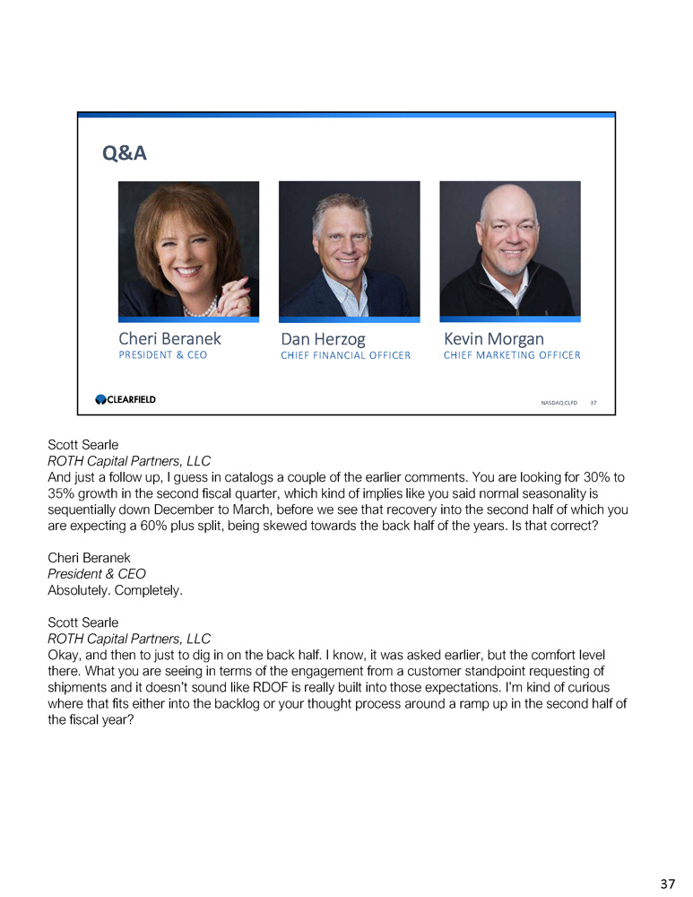 Cheri Beranek PRESIDENT & CEO Dan Herzog CHIEF FINANCIAL OFFICER Q&A NASDAQ:CLFD 37 Kevin Morgan CHIEF MARKETING OFFICER Scott Searle ROTH Capital Partners, LLC And just a follow up, I guess in catalogs a couple of the earlier comments. You are looking for 30% to 35% growth in the second fiscal quarter, which kind of implies like you said normal seasonality is sequentially down December to March, before we see that recovery into the second half of which you are expecting a 60% plus split, being skewed towards the back half of the years. Is that correct? Cheri Beranek President & CEO Absolutely. Completely. Scott Searle ROTH Capital Partners, LLC Okay, and then to just to dig in on the back half. I know, it was asked earlier, but the comfort level there. What you are seeing in terms of the engagement from a customer standpoint requesting of shipments and it doesn’t sound like RDOF is really built into those expectations. I’m kind of curious where that fits either into the backlog or your thought process around a ramp up in the second half of the fiscal year? 37