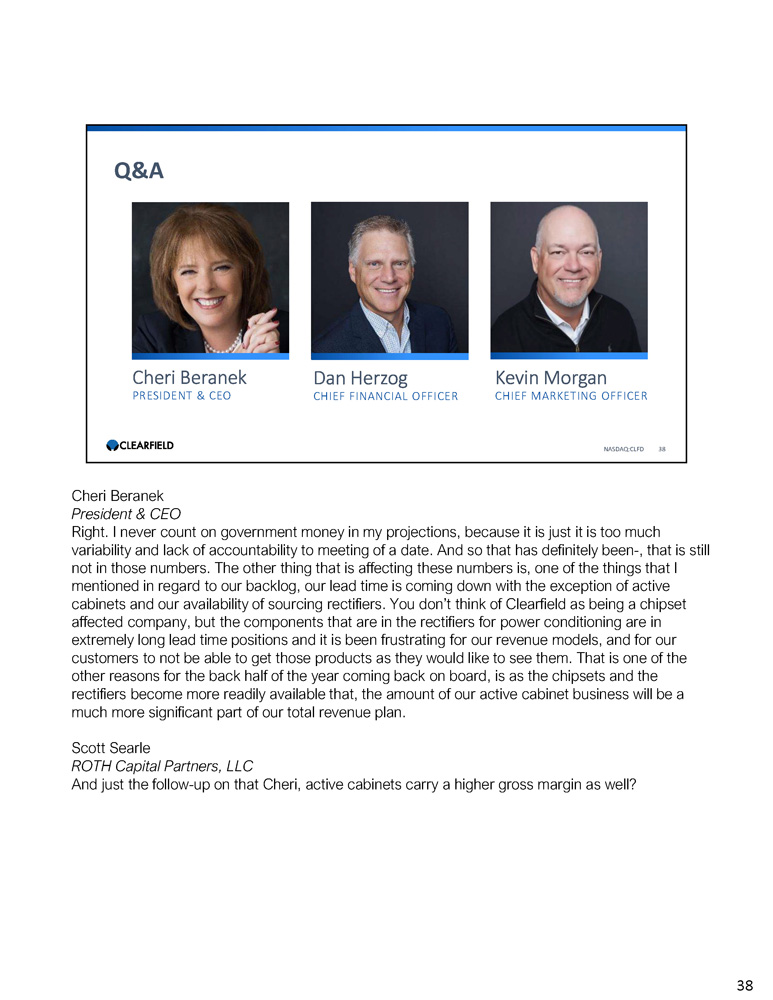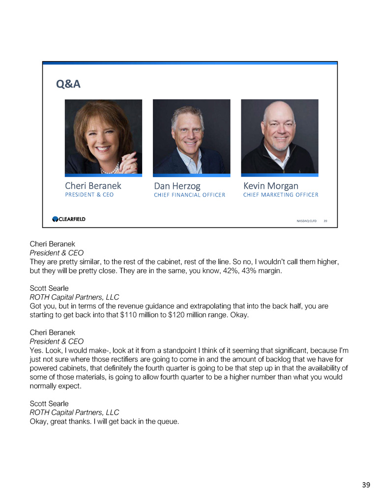Cheri Beranek PRESIDENT & CEO Dan Herzog CHIEF FINANCIAL OFFICER Q&A NASDAQ:CLFD 38 Kevin Morgan CHIEF MARKETING OFFICER Cheri Beranek President & CEO Right. I never count on government money in my projections, because it is just it is too much variability and lack of accountability to meeting of a date. And so that has definitely been - , that is still not in those numbers. The other thing that is affecting these numbers is, one of the things that I mentioned in regard to our backlog, our lead time is coming down with the exception of active cabinets and our availability of sourcing rectifiers. You don’t think of Clearfield as being a chipset affected company, but the components that are in the rectifiers for power conditioning are in extremely long lead time positions and it is been frustrating for our revenue models, and for our customers to not be able to get those products as they would like to see them. That is one of the other reasons for the back half of the year coming back on board, is as the chipsets and the rectifiers become more readily available that, the amount of our active cabinet business will be a much more significant part of our total revenue plan. Scott Searle ROTH Capital Partners, LLC And just the follow - up on that Cheri, active cabinets carry a higher gross margin as well? 38