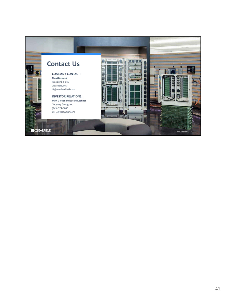 NASDAQ:CLFD 41 Contact Us COMPANY CONTACT: Cheri Beranek President & CEO Clearfield, Inc. IR@seeclearfield.com INVESTOR RELATIONS: Matt Glover and Jackie Keshner Gateway Group, Inc. (949) 574 - 3860 CLFD@gatewayir.com 41