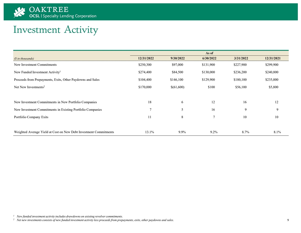 Portfolio Highlights As of ($ in thousands, at fair value) 12/31/2022 9/30/2022 6/30/2022 3/31/2022 12/31/2021 Investments at Fair Value $2,642,870 $2,494,111 $2,565,389 $2,644,775 $2,558,623 Number of Portfolio Companies 156 149 151 146 140 Average Portfolio Company Debt Investment Size $16,500 $16,500 $16,700 $17,700 $18,500 Asset Class: First Lien 71.9% 71.2% 70.0% 69.0% 69.7% Second Lien 14.4 15.7 16.6 17.3 17.7 Unsecured Debt 2.4 2.3 2.5 2.1 1.0 Equity 4.3 4.2 4.3 4.5 4.2 Joint Venture Interests 7.0 6.7 6.6 7.1 7.4 Interest Rate Type for Debt Investments: % Floating-Rate 87.3% 86.5% 87.8% 89.0% 91.6% % Fixed-Rate 12.7 13.5 12.2 11.0 8.4 Yields: 1 Weighted Average Yield on Debt Investments 11.6% 10.6% 9.3% 8.8% 8.7% Cash Component of Weighted Average Yield on Debt Investments 10.3 9.3 8.2 7.6 7.5 2 Weighted Average Yield on Total Portfolio Investments 11.2 10.2 9.0 8.4 8.3 Note: Numbers may not sum due to rounding. 1 Annual stated yield earned plus net annual amortization of OID or premium earned on accruing investments, including the Company's share of the return on debt investments in the Kemper JV and Glick JV, and excluding any amortization or accretion of interest income resulting solely from the cost basis established by ASC 805 for the assets acquired in connection with the merger of Oaktree Strategic Income Corporation with an into us (the “OCSI Merger”). See page 21 for a description of the non-GAAP financial measures. 2 Annual stated yield earned plus net annual amortization of OID or premium earned on accruing investments and dividend income, including the Company's share of the return on debt investments in the Kemper JV and Glick JV, and excluding any amortization or accretion of interest income resulting solely from the cost basis established by ASC 805 for the assets acquired in connection with the OCSI Merger. See page 21 for a description of the non-GAAP financial measures. 8