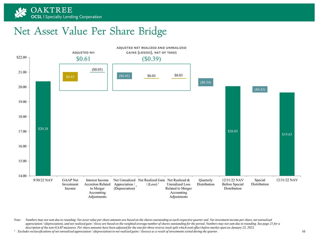 | | Net asset value (NAV) per share was $19.63 as of December 31, 2022, as compared with $20.38 as of September 30, 2022. The decrease was primarily the result of the $0.42 per share special distribution paid by the Company during the quarter and unrealized depreciation related to credit spread widening on debt investments. |