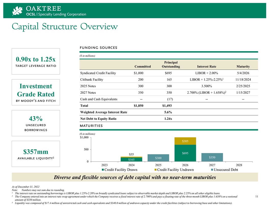 Net Asset Value Per Share Bridge adjusted net realized and unrealized adjusted nii gains (losses), net of taxes $22.00 $0.61 ($0.39) ($0.03) 21.00 $0.03 $0.03 ($0.45) $0.63 ($0.54) 20.00 ($0.42) 19.00 18.00 $20.38 17.00 $20.05 $19.63 16.00 15.00 14.00 9/30/22 NAV GAAP Net Interest Income Net Unrealized Net Realized Gain Net Realized & Quarterly 12/31/22 NAV Special 12/31/22 NAV 1 Investment Accretion Related Appreciation / / (Loss) Unrealized Loss Distribution Before Special Distribution 1 Income to Merger (Depreciation) Related to Merger Distribution Accounting Accounting Adjustments Adjustments Note: Numbers may not sum due to rounding. Net asset value per share amounts are based on the shares outstanding at each respective quarter end. Net investment income per share, net unrealized appreciation / (depreciation), and net realized gain / (loss) are based on the weighted average number of shares outstanding for the period. Numbers may not sum due to rounding. See page 21 for a description of the non-GAAP measures. Per share amounts have been adjusted for the one-for-three reverse stock split which took effect before market open on January 23, 2023. 1 Excludes reclassifications of net unrealized appreciation / (depreciation) to net realized gains / (losses) as a result of investments exited during the quarter. 10