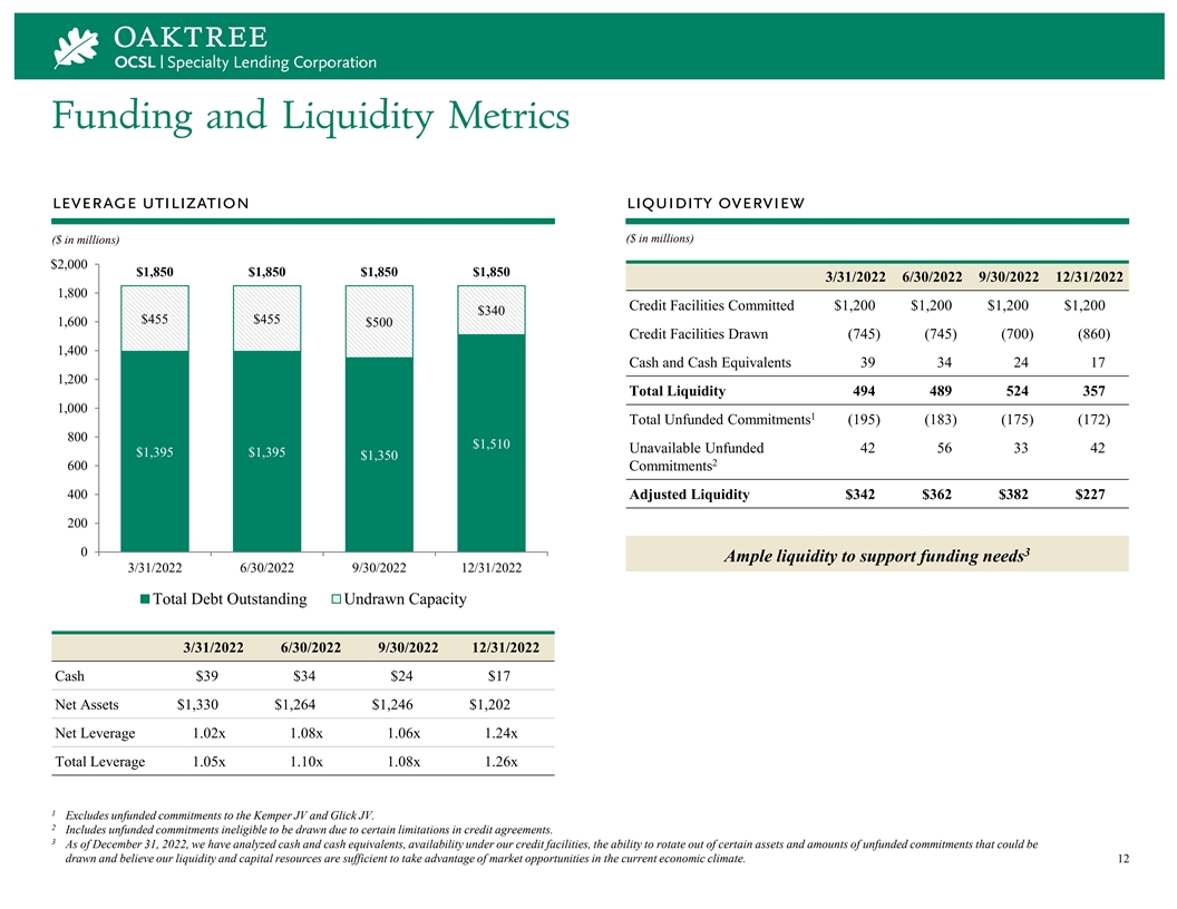Funding and Liquidity Metrics leverage utilization liquidity overview ($ in millions) ($ in millions) $2,000 $1,850 $1,850 $1,850 $1,850 3/31/2022 6/30/2022 9/30/2022 12/31/2022 1,800 Credit Facilities Committed $1,200 $1,200 $1,200 $1,200 $340 $455 $455 1,600 $500 Credit Facilities Drawn (745) (745) (700) (860) 1,400 Cash and Cash Equivalents 39 34 24 17 1,200 Total Liquidity 494 489 524 357 1,000 1 Total Unfunded Commitments (195) (183) (175) (172) 800 $1,510 Unavailable Unfunded 42 56 33 42 $1,395 $1,395 $1,350 2 600 Commitments 400 Adjusted Liquidity $342 $362 $382 $227 200 0 3 Ample liquidity to support funding needs 3/31/2022 6/30/2022 9/30/2022 12/31/2022 Total Debt Outstanding Undrawn Capacity 3/31/2022 6/30/2022 9/30/2022 12/31/2022 Cash $39 $34 $24 $17 Net Assets $1,330 $1,264 $1,246 $1,202 Net Leverage 1.02x 1.08x 1.06x 1.24x Total Leverage 1.05x 1.10x 1.08x 1.26x 1 Excludes unfunded commitments to the Kemper JV and Glick JV. 2 Includes unfunded commitments ineligible to be drawn due to certain limitations in credit agreements. 3 As of December 31, 2022, we have analyzed cash and cash equivalents, availability under our credit facilities, the ability to rotate out of certain assets and amounts of unfunded commitments that could be drawn and believe our liquidity and capital resources are sufficient to take advantage of market opportunities in the current economic climate. 12