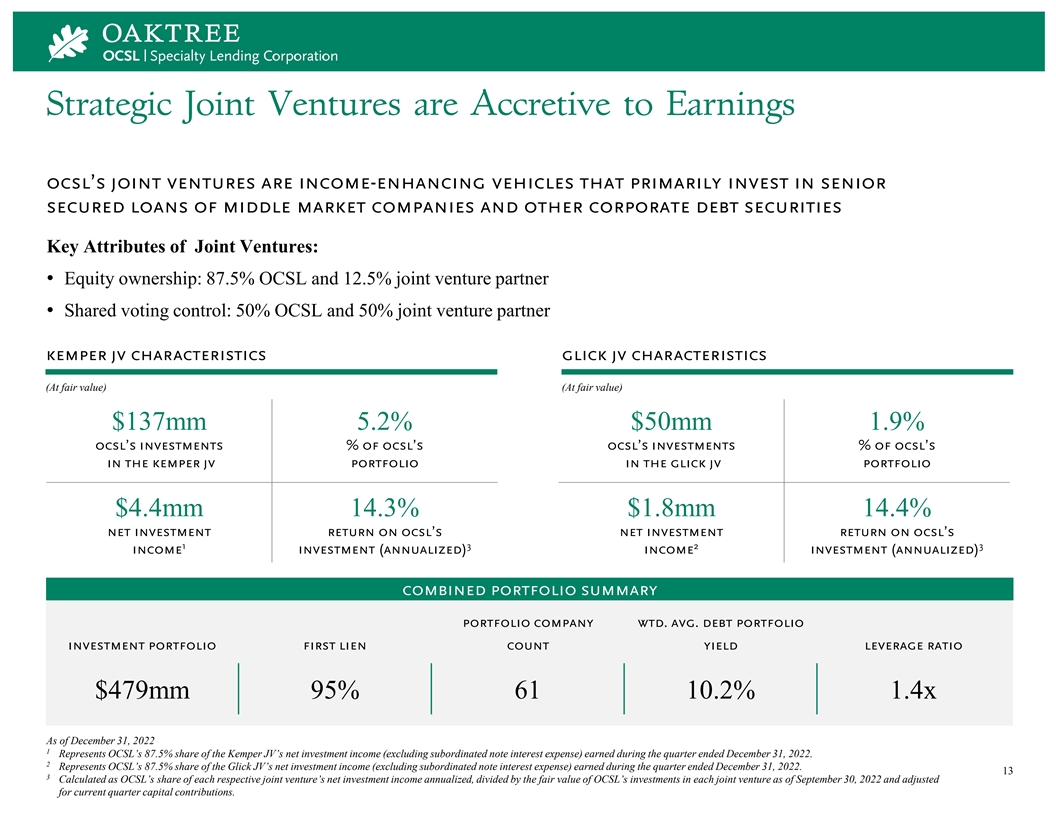 Strong Earnings and Dividend Growth adjusted net investment income per share and roe quarterly dividends declared per share ($ in millions) ($ in millions) 1 15% increase from December 31, 2021 10.0% LTM return on adjusted NII $ 0.70 $0.60 $0.55 $0.54 $0.61 $0.51 $0.495 0.60 $0.48 $0.55 0.50 $0.53 $0.51 0.50 0.40 0.40 0.30 0.30 0.20 0.20 0.10 0.10 0.00 0.00 3/31/22 6/30/22 9/30/22 12/31/22 12/31/21 3/31/22 6/30/22 9/30/22 12/31/22 Adjusted Net Investment Income Per Share Quarterly Dividends Declared Per Share OCSL has delivered strong earnings and dividend growth over the last year on the strength of the portfolio and positive impact from rising interest rates Note: Please refer to page 21 for a description of adjusted net investment income, which is a non-GAAP financial measure. GAAP net investment income per share was $0.63, $0.59, $0.66 and $0.66 for the quarters ended December 31, 2022, September 30, 2022, June 30, 2022 and March 31, 2022. The Company completed a 1-for-3 reverse stock split on January 20, 2023, effective as of the commencement of trading on January 23, 2023. All share amounts and per share information included in this presentation reflect the reverse stock split on a retroactive basis. 1 Calculated as reported adjusted net investment income per share divided by beginning NAV per share. 15