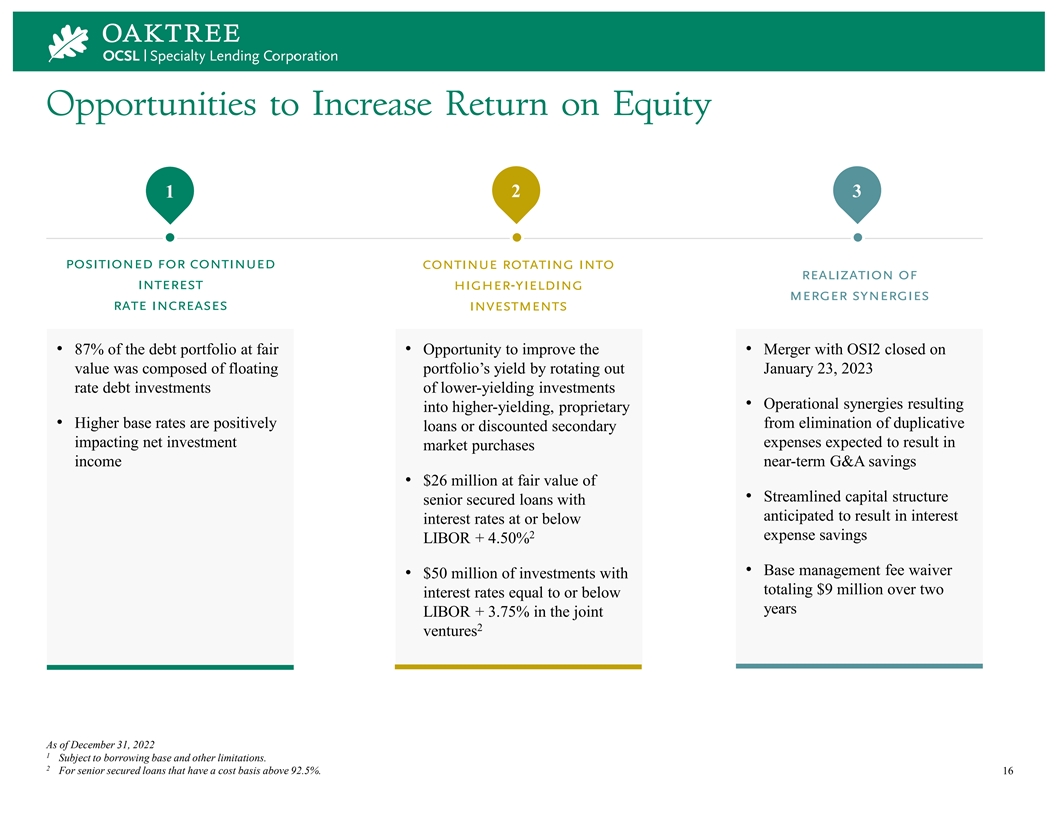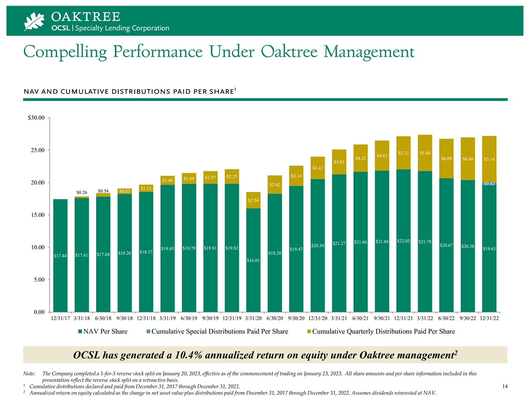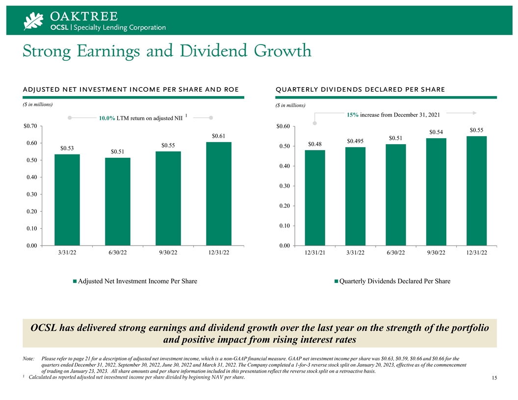 Compelling Performance Under Oaktree Management 1 nav and cumulative distributions paid per share $30.00 25.00 $5.12 $5.60 $4.65 $4.22 $6.09 $6.60 $7.14 $3.83 $3.47 $3.14 $2.25 $1.97 $1.68 $1.40 20.00 $0.42 $2.82 $1.11 $0.54 $0.83 $0.26 $2.54 15.00 $22.03 $21.84 $21.78 $21.66 $21.27 $20.54 $20.67 $20.38 10.00 $19.65 $19.79 $19.81 $19.82 $19.47 $19.63 $18.57 $18.26 $18.28 $17.84 $17.61 $17.44 $16.01 5.00 0.00 12/31/17 3/31/18 6/30/18 9/30/18 12/31/18 3/31/19 6/30/19 9/30/19 12/31/19 3/31/20 6/30/20 9/30/20 12/31/20 3/31/21 6/30/21 9/30/21 12/31/21 3/31/22 6/30/22 9/30/22 12/31/22 NAV Per Share Cumulative Special Distributions Paid Per Share Cumulative Quarterly Distributions Paid Per Share 2 OCSL has generated a 10.4% annualized return on equity under Oaktree management Note: The Company completed a 1-for-3 reverse stock split on January 20, 2023, effective as of the commencement of trading on January 23, 2023. All share amounts and per share information included in this presentation reflect the reverse stock split on a retroactive basis. 1 Cumulative distributions declared and paid from December 31, 2017 through December 31, 2022. 14 2 Annualized return on equity calculated as the change in net asset value plus distributions paid from December 31, 2017 through December 31, 2022. Assumes dividends reinvested at NAV.