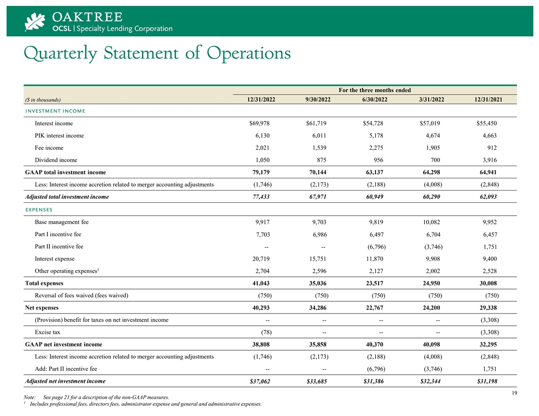 OCSL & OSI2 Combined Company Metrics portfolio and balance sheet metrics (At fair value, $ in thousands) OCSL OSI2 Combined Company Portfolio: Investments at Fair Value $2,642,870 $572,028 $3,214,898 1 Top 10 Investments (%) 19.1% 23.1% 19.5% Number of Portfolio Companies 156 113 167 First Lien (%) 72% 85% 74% Second Lien (%) 14% 12% 14% Unsecured (%) 2% 0% 2% Equity (%) 4% 3% 4% Joint Venture Interests (%) 7% - 6% Non-Accruals at Cost - - - Balance Sheet: Total Assets $2,767,260 $596,723 $3,363,983 Cash and Cash Equivalents $17,382 $9,296 $26,678 2 Total Debt Outstanding $1,463,624 $273,316 $1,736,940 Net Assets $1,201,989 $313,092 $1,515,081 Total Debt to Equity Ratio 1.26x 0.87x 1.18x Net Debt to Equity Ratio 1.24x 0.84x 1.16x 1 Unsecured Borrowings (%) 43% - 36% As of December 31, 2022 Note: This select financial information of OSI2 is not a comprehensive statement of OSI2’s financial position, results of operations or cash flows for any period. Ernst & Young LLP has not audited, reviewed, compiled, or performed any procedures with respect to OSI2’s select financial information. Accordingly, Ernst & Young LLP does not express an opinion or any other form of assurance with respect thereto. 1 Excludes the Company’s joint venture investments. 18 2 Net of unamortized financing costs.