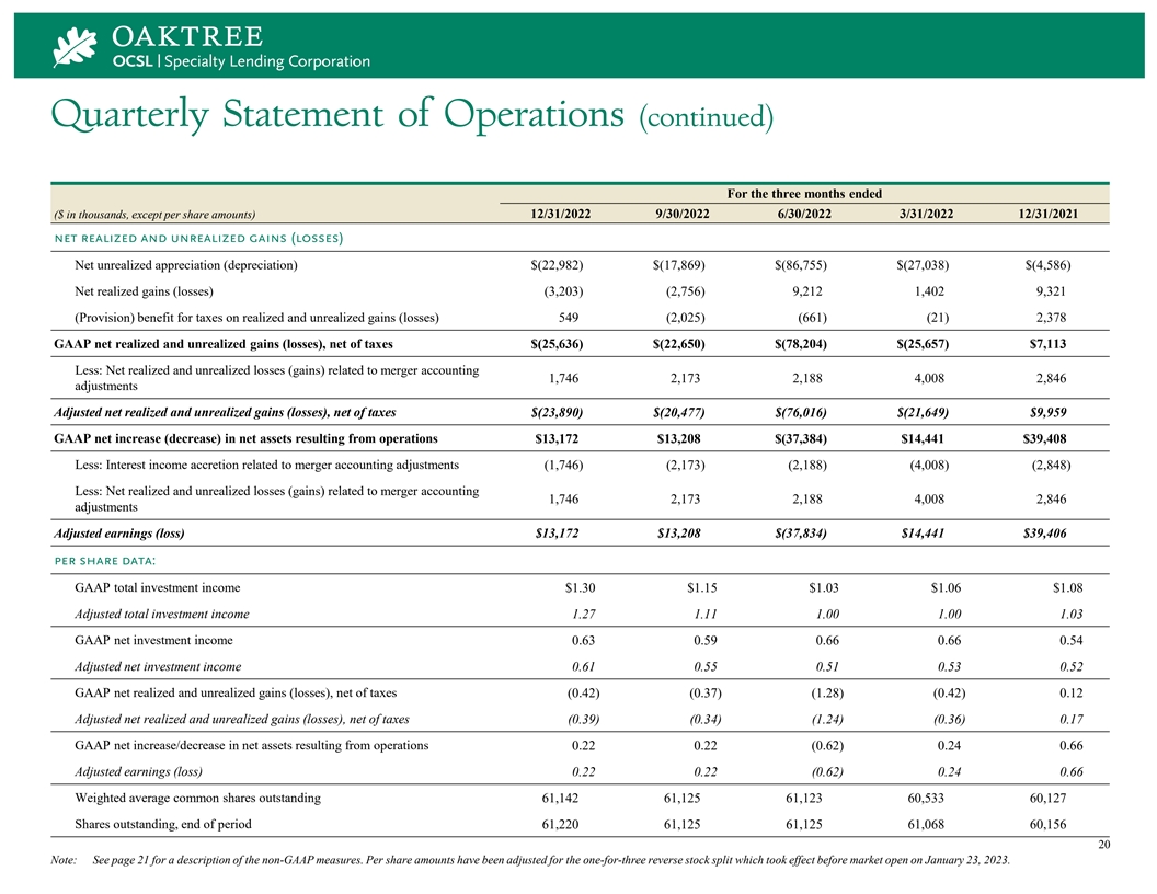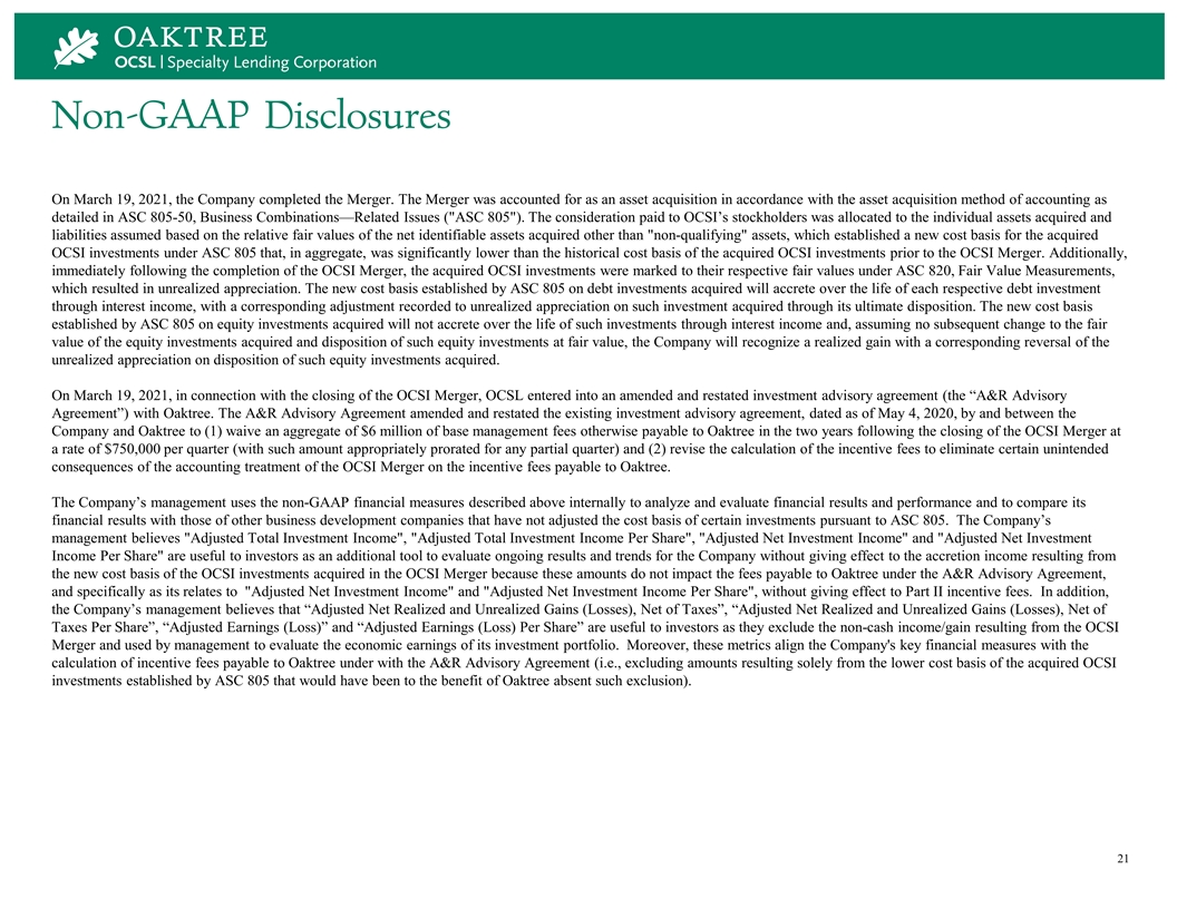 Non-GAAP Disclosures On March 19, 2021, the Company completed the Merger. The Merger was accounted for as an asset acquisition in accordance with the asset acquisition method of accounting as detailed in ASC 805-50, Business Combinations—Related Issues ( ASC 805 ). The consideration paid to OCSI’s stockholders was allocated to the individual assets acquired and liabilities assumed based on the relative fair values of the net identifiable assets acquired other than non-qualifying assets, which established a new cost basis for the acquired OCSI investments under ASC 805 that, in aggregate, was significantly lower than the historical cost basis of the acquired OCSI investments prior to the OCSI Merger. Additionally, immediately following the completion of the OCSI Merger, the acquired OCSI investments were marked to their respective fair values under ASC 820, Fair Value Measurements, which resulted in unrealized appreciation. The new cost basis established by ASC 805 on debt investments acquired will accrete over the life of each respective debt investment through interest income, with a corresponding adjustment recorded to unrealized appreciation on such investment acquired through its ultimate disposition. The new cost basis established by ASC 805 on equity investments acquired will not accrete over the life of such investments through interest income and, assuming no subsequent change to the fair value of the equity investments acquired and disposition of such equity investments at fair value, the Company will recognize a realized gain with a corresponding reversal of the unrealized appreciation on disposition of such equity investments acquired. On March 19, 2021, in connection with the closing of the OCSI Merger, OCSL entered into an amended and restated investment advisory agreement (the “A&R Advisory Agreement”) with Oaktree. The A&R Advisory Agreement amended and restated the existing investment advisory agreement, dated as of May 4, 2020, by and between the Company and Oaktree to (1) waive an aggregate of $6 million of base management fees otherwise payable to Oaktree in the two years following the closing of the OCSI Merger at a rate of $750,000 per quarter (with such amount appropriately prorated for any partial quarter) and (2) revise the calculation of the incentive fees to eliminate certain unintended consequences of the accounting treatment of the OCSI Merger on the incentive fees payable to Oaktree. The Company’s management uses the non-GAAP financial measures described above internally to analyze and evaluate financial results and performance and to compare its financial results with those of other business development companies that have not adjusted the cost basis of certain investments pursuant to ASC 805. The Company’s management believes Adjusted Total Investment Income , Adjusted Total Investment Income Per Share , Adjusted Net Investment Income and Adjusted Net Investment Income Per Share are useful to investors as an additional tool to evaluate ongoing results and trends for the Company without giving effect to the accretion income resulting from the new cost basis of the OCSI investments acquired in the OCSI Merger because these amounts do not impact the fees payable to Oaktree under the A&R Advisory Agreement, and specifically as its relates to Adjusted Net Investment Income and Adjusted Net Investment Income Per Share , without giving effect to Part II incentive fees. In addition, the Company’s management believes that “Adjusted Net Realized and Unrealized Gains (Losses), Net of Taxes”, “Adjusted Net Realized and Unrealized Gains (Losses), Net of Taxes Per Share”, “Adjusted Earnings (Loss)” and “Adjusted Earnings (Loss) Per Share” are useful to investors as they exclude the non-cash income/gain resulting from the OCSI Merger and used by management to evaluate the economic earnings of its investment portfolio. Moreover, these metrics align the Company's key financial measures with the calculation of incentive fees payable to Oaktree under with the A&R Advisory Agreement (i.e., excluding amounts resulting solely from the lower cost basis of the acquired OCSI investments established by ASC 805 that would have been to the benefit of Oaktree absent such exclusion). 21