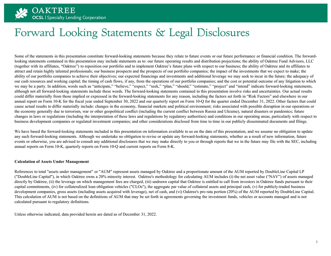 Forward Looking Statements & Legal Disclosures Some of the statements in this presentation constitute forward-looking statements because they relate to future events or our future performance or financial condition. The forward- looking statements contained in this presentation may include statements as to: our future operating results and distribution projections; the ability of Oaktree Fund Advisors, LLC (together with its affiliates, “Oaktree”) to reposition our portfolio and to implement Oaktree’s future plans with respect to our business; the ability of Oaktree and its affiliates to attract and retain highly talented professionals; our business prospects and the prospects of our portfolio companies; the impact of the investments that we expect to make; the ability of our portfolio companies to achieve their objectives; our expected financings and investments and additional leverage we may seek to incur in the future; the adequacy of our cash resources and working capital; the timing of cash flows, if any, from the operations of our portfolio companies; and the cost or potential outcome of any litigation to which we may be a party. In addition, words such as “anticipate,” “believe,” “expect,” “seek,” “plan,” “should,” “estimate,” “project” and “intend” indicate forward-looking statements, although not all forward-looking statements include these words. The forward-looking statements contained in this presentation involve risks and uncertainties. Our actual results could differ materially from those implied or expressed in the forward-looking statements for any reason, including the factors set forth in “Risk Factors” and elsewhere in our annual report on Form 10-K for the fiscal year ended September 30, 2022 and our quarterly report on Form 10-Q for the quarter ended December 31, 2022. Other factors that could cause actual results to differ materially include: changes in the economy, financial markets and political environment; risks associated with possible disruption in our operations or the economy generally due to terrorism, war or other geopolitical conflict (including the current conflict between Russia and Ukraine), natural disasters or pandemics; future changes in laws or regulations (including the interpretation of these laws and regulations by regulatory authorities) and conditions in our operating areas, particularly with respect to business development companies or regulated investment companies; and other considerations disclosed from time to time in our publicly disseminated documents and filings. We have based the forward-looking statements included in this presentation on information available to us on the date of this presentation, and we assume no obligation to update any such forward-looking statements. Although we undertake no obligation to revise or update any forward-looking statements, whether as a result of new information, future events or otherwise, you are advised to consult any additional disclosures that we may make directly to you or through reports that we in the future may file with the SEC, including annual reports on Form 10-K, quarterly reports on Form 10-Q and current reports on Form 8-K. Calculation of Assets Under Management References to total assets under management or AUM represent assets managed by Oaktree and a proportionate amount of the AUM reported by DoubleLine Capital LP ( DoubleLine Capital ), in which Oaktree owns a 20% minority interest. Oaktree's methodology for calculating AUM includes (i) the net asset value (“NAV”) of assets managed directly by Oaktree, (ii) the leverage on which management fees are charged, (iii) undrawn capital that Oaktree is entitled to call from investors in Oaktree funds pursuant to their capital commitments, (iv) for collateralized loan obligation vehicles ( CLOs ), the aggregate par value of collateral assets and principal cash, (v) for publicly-traded business development companies, gross assets (including assets acquired with leverage), net of cash, and (vi) Oaktree's pro rata portion (20%) of the AUM reported by DoubleLine Capital. This calculation of AUM is not based on the definitions of AUM that may be set forth in agreements governing the investment funds, vehicles or accounts managed and is not calculated pursuant to regulatory definitions. Unless otherwise indicated, data provided herein are dated as of December 31, 2022. 1