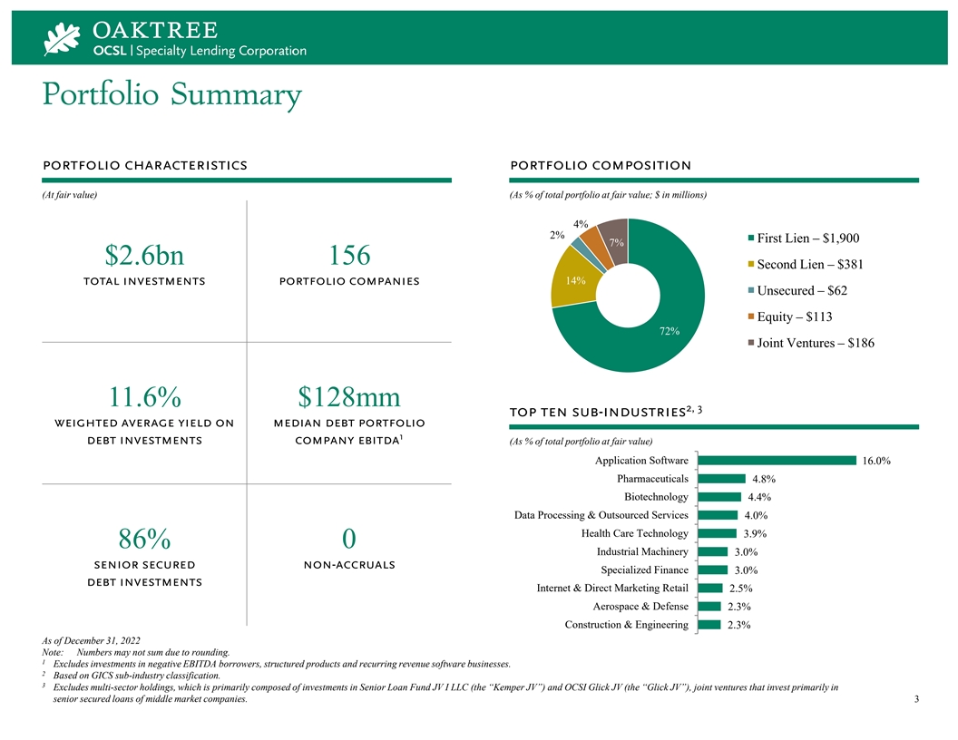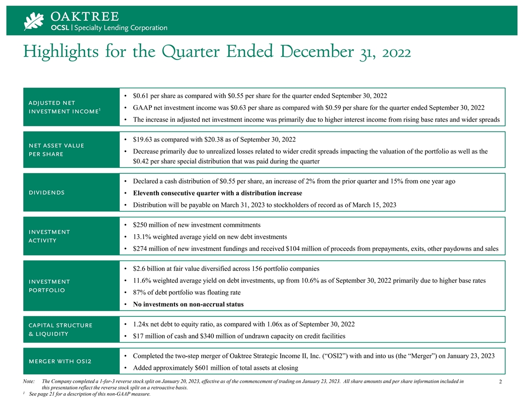 Highlights for the Quarter Ended December 31, 2022 • $0.61 per share as compared with $0.55 per share for the quarter ended September 30, 2022 adjusted net • GAAP net investment income was $0.63 per share as compared with $0.59 per share for the quarter ended September 30, 2022 1 investment income • The increase in adjusted net investment income was primarily due to higher interest income from rising base rates and wider spreads • $19.63 as compared with $20.38 as of September 30, 2022 net asset value • Decrease primarily due to unrealized losses related to wider credit spreads impacting the valuation of the portfolio as well as the per share $0.42 per share special distribution that was paid during the quarter • Declared a cash distribution of $0.55 per share, an increase of 2% from the prior quarter and 15% from one year ago dividends • Eleventh consecutive quarter with a distribution increase • Distribution will be payable on March 31, 2023 to stockholders of record as of March 15, 2023 • $250 million of new investment commitments investment • 13.1% weighted average yield on new debt investments activity • $274 million of new investment fundings and received $104 million of proceeds from prepayments, exits, other paydowns and sales • $2.6 billion at fair value diversified across 156 portfolio companies • 11.6% weighted average yield on debt investments, up from 10.6% as of September 30, 2022 primarily due to higher base rates investment portfolio • 87% of debt portfolio was floating rate • No investments on non-accrual status • 1.24x net debt to equity ratio, as compared with 1.06x as of September 30, 2022 capital structure & liquidity • $17 million of cash and $340 million of undrawn capacity on credit facilities • Completed the two-step merger of Oaktree Strategic Income II, Inc. (“OSI2”) with and into us (the “Merger”) on January 23, 2023 merger with osi2 • Added approximately $601 million of total assets at closing Note: The Company completed a 1-for-3 reverse stock split on January 20, 2023, effective as of the commencement of trading on January 23, 2023. All share amounts and per share information included in 2 this presentation reflect the reverse stock split on a retroactive basis. 1 See page 21 for a description of this non-GAAP measure.