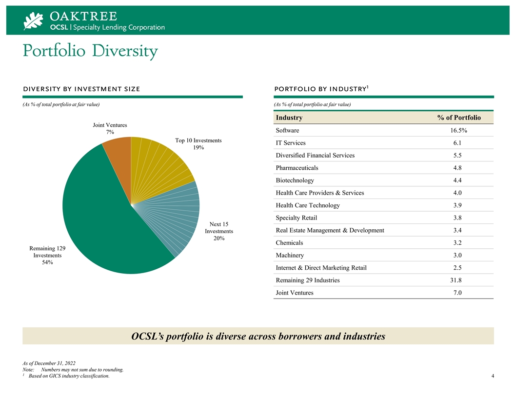 Portfolio Summary portfolio characteristics portfolio composition (At fair value) (As % of total portfolio at fair value; $ in millions) 4% 2% First Lien – $1,900 7% $2.6bn 156 Second Lien – $381 14% total investments portfolio companies Unsecured – $62 Equity – $113 72% Joint Ventures – $186 11.6% $128mm 2, 3 top ten sub-industries weighted average yield on median debt portfolio 1 debt investments company ebitda (As % of total portfolio at fair value) Application Software 16.0% Pharmaceuticals 4.8% Biotechnology 4.4% Data Processing & Outsourced Services 4.0% Health Care Technology 3.9% 86% 0 Industrial Machinery 3.0% senior secured non-accruals Specialized Finance 3.0% debt investments Internet & Direct Marketing Retail 2.5% Aerospace & Defense 2.3% Construction & Engineering 2.3% As of December 31, 2022 Note: Numbers may not sum due to rounding. 1 Excludes investments in negative EBITDA borrowers, structured products and recurring revenue software businesses. 2 Based on GICS sub-industry classification. 3 Excludes multi-sector holdings, which is primarily composed of investments in Senior Loan Fund JV I LLC (the “Kemper JV”) and OCSI Glick JV (the “Glick JV”), joint ventures that invest primarily in senior secured loans of middle market companies. 3
