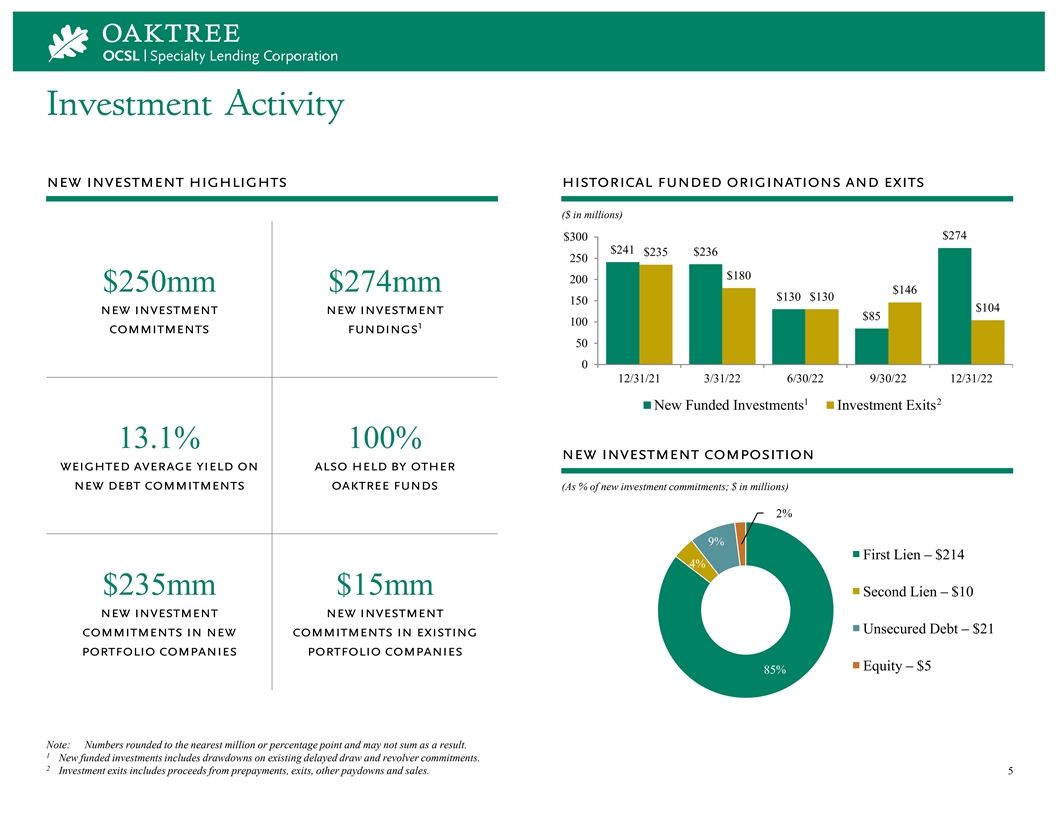 Portfolio Diversity 1 diversity by investment size portfolio by industry (As % of total portfolio at fair value) (As % of total portfolio at fair value) Industry % of Portfolio Joint Ventures Software 16.5% 7% Top 10 Investments IT Services 6.1 19% Diversified Financial Services 5.5 Pharmaceuticals 4.8 Biotechnology 4.4 Health Care Providers & Services 4.0 Health Care Technology 3.9 Specialty Retail 3.8 Next 15 Real Estate Management & Development 3.4 Investments 20% Chemicals 3.2 Remaining 129 Investments Machinery 3.0 54% Internet & Direct Marketing Retail 2.5 Remaining 29 Industries 31.8 Joint Ventures 7.0 OCSL’s portfolio is diverse across borrowers and industries As of December 31, 2022 Note: Numbers may not sum due to rounding. 1 Based on GICS industry classification. 4