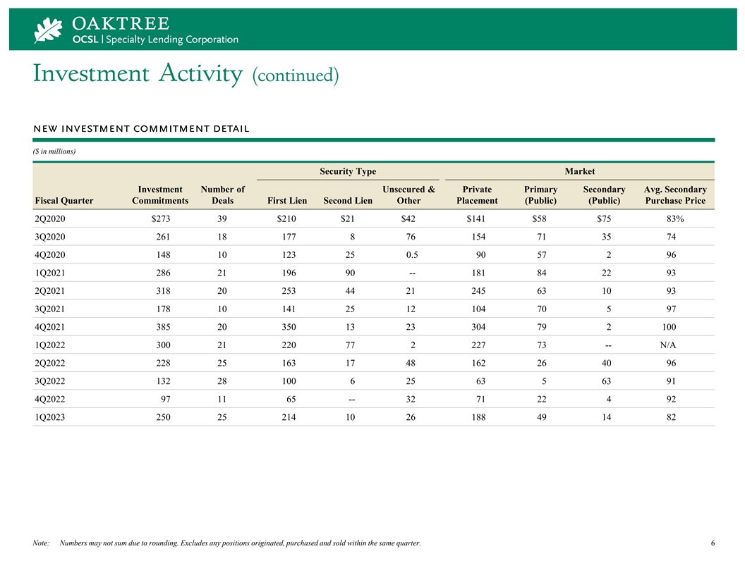 Investment Activity new investment highlights historical funded originations and exits ($ in millions) $274 $300 $241 $235 $236 250 $180 200 $250mm $274mm $146 $130 $130 150 $104 new investment new investment $85 100 1 commitments fundings 50 0 12/31/21 3/31/22 6/30/22 9/30/22 12/31/22 1 2 New Funded Investments Investment Exits 13.1% 100% new investment composition weighted average yield on also held by other new debt commitments oaktree funds (As % of new investment commitments; $ in millions) 2% 9% First Lien – $214 4% $235mm $15mm Second Lien – $10 new investment new investment Unsecured Debt – $21 commitments in new commitments in existing portfolio companies portfolio companies Equity – $5 85% Note: Numbers rounded to the nearest million or percentage point and may not sum as a result. 1 New funded investments includes drawdowns on existing delayed draw and revolver commitments. 2 Investment exits includes proceeds from prepayments, exits, other paydowns and sales. 5
