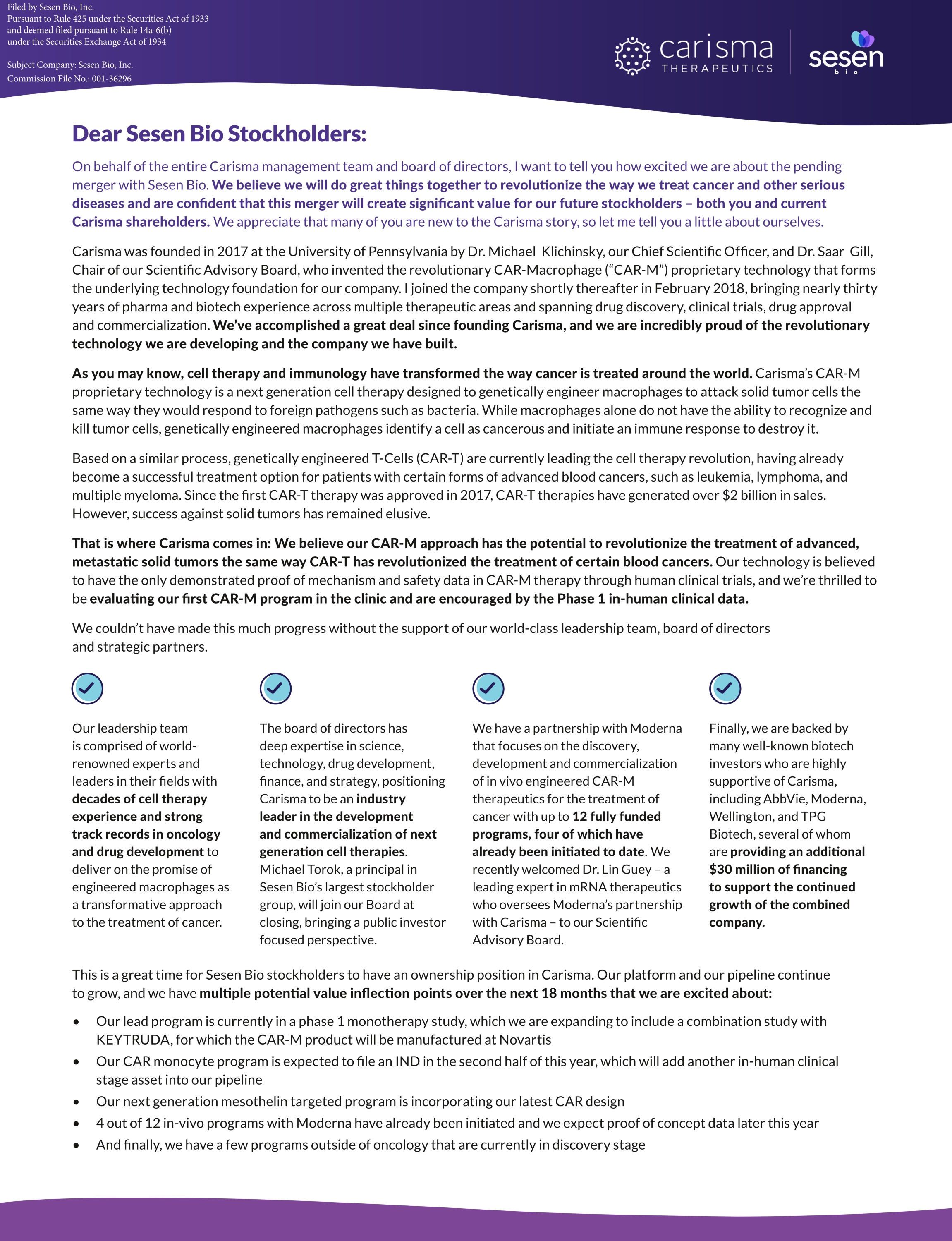 Dear Sesen Bio Stockholders: On behalf of the entire Carisma management team and board of directors, I want to tell you how excited we are about the pending merger with Sesen Bio. We believe we will do great things together to revolutionize the way we treat cancer and other serious diseases and are confident that this merger will create significant value for our future stockholders – both you and current Carisma shareholders. We appreciate that many of you are new to the Carisma story, so let me tell you a little about ourselves. Carisma was founded in 2017 at the University of Pennsylvania by Dr. Michael Klichinsky, our Chief Scientific Officer, and Dr. Saar Gill, Chair of our Scientific Advisory Board, who invented the revolutionary CAR-Macrophage (“CAR-M”) proprietary technology that forms the underlying technology foundation for our company. I joined the company shortly thereafter in February 2018, bringing nearly thirty years of pharma and biotech experience across multiple therapeutic areas and spanning drug discovery, clinical trials, drug approval and commercialization. We’ve accomplished a great deal since founding Carisma, and we are incredibly proud of the revolutionary technology we are developing and the company we have built. As you may know, cell therapy and immunology have transformed the way cancer is treated around the world. Carisma’s CAR-M proprietary technology is a next generation cell therapy designed to genetically engineer macrophages to attack solid tumor cells the same way they would respond to foreign pathogens such as bacteria. While macrophages alone do not have the ability to recognize and kill tumor cells, genetically engineered macrophages identify a cell as cancerous and initiate an immune response to destroy it. Based on a similar process, genetically engineered T-Cells (CAR-T) are currently leading the cell therapy revolution, having already become a successful treatment option for patients with certain forms of advanced blood cancers, such as leukemia, lymphoma, and multiple myeloma. Since the first CAR-T therapy was approved in 2017, CAR-T therapies have generated over $2 billion in sales. However, success against solid tumors has remained elusive. That is where Carisma comes in: We believe our CAR-M approach has the potential to revolutionize the treatment of advanced, metastatic solid tumors the same way CAR-T has revolutionized the treatment of certain blood cancers. Our technology is believed to have the only demonstrated proof of mechanism and safety data in CAR-M therapy through human clinical trials, and we’re thrilled to be evaluating our first CAR-M program in the clinic and are encouraged by the Phase 1 in-human clinical data. We couldn’t have made this much progress without the support of our world-class leadership team, board of directors and strategic partners. Our leadership team is comprised of world- renowned experts and leaders in their fields with decades of cell therapy experience and strong track records in oncology and drug development to deliver on the promise of engineered macrophages as a transformative approach to the treatment of cancer. The board of directors has deep expertise in science, technology, drug development, finance, and strategy, positioning Carisma to be an industry leader in the development and commercialization of next generation cell therapies. Michael Torok, a principal in Sesen Bio’s largest stockholder group, will join our Board at closing, bringing a public investor focused perspective. We have a partnership with Moderna that focuses on the discovery, development and commercialization of in vivo engineered CAR-M therapeutics for the treatment of cancer with up to 12 fully funded programs, four of which have already been initiated to date. We recently welcomed Dr. Lin Guey – a leading expert in mRNA therapeutics who oversees Moderna’s partnership with Carisma – to our Scientific Advisory Board. Finally, we are backed by many well-known biotech investors who are highly supportive of Carisma, including AbbVie, Moderna, Wellington, and TPG Biotech, several of whom are providing an additional $30 million of financing to support the continued growth of the combined company. This is a great time for Sesen Bio stockholders to have an ownership position in Carisma. Our platform and our pipeline continue to grow, and we have multiple potential value inflection points over the next 18 months that we are excited about: • Our lead program is currently in a phase 1 monotherapy study, which we are expanding to include a combination study with KEYTRUDA, for which the CAR-M product will be manufactured at Novartis • Our CAR monocyte program is expected to file an IND in the second half of this year, which will add another in-human clinical stage asset into our pipeline • Our next generation mesothelin targeted program is incorporating our latest CAR design • 4 out of 12 in-vivo programs with Moderna have already been initiated and we expect proof of concept data later this year • And finally, we have a few programs outside of oncology that are currently in discovery stage Filed by Sesen Bio, Inc. Pursuant to Rule 425 under the Securities Act of 1933 and deemed filed pursuant to Rule 14a-6(b) under the Securities Exchange Act of 1934 Subject Company: Sesen Bio, Inc. Commission File No.: 001-36296