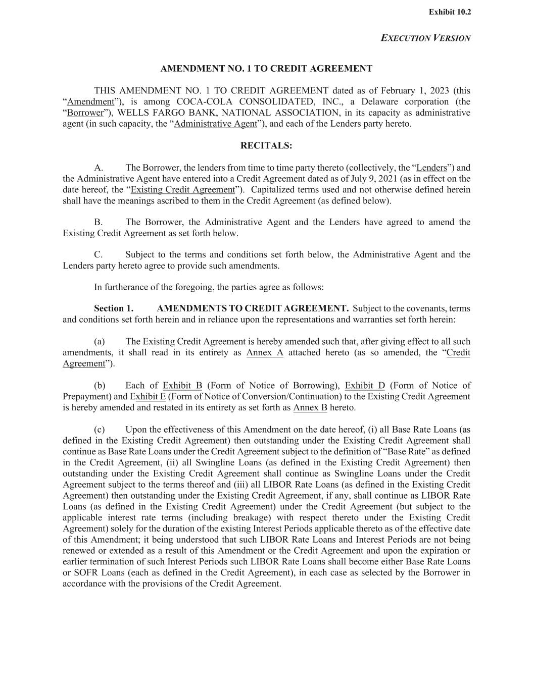 Form of Notice of Conversion/Continuation NOTICE OF CONVERSION/CONTINUATION Dated as of: _____________ Wells Fargo Bank, National Association, as Administrative Agent MAC D 1109-019 1525 West W.T. Harris Blvd. Charlotte, North Carolina 28262 Attention: Syndication Agency Services Ladies and Gentlemen: This irrevocable Notice of Conversion/Continuation (this “Notice”) is delivered to you pursuant to Section 4.2 of the Credit Agreement dated as of July 9, 2021 (the “Credit Agreement”), by and among Coca-Cola Consolidated, Inc., a Delaware corporation (the “Borrower”), the Lenders party thereto and Wells Fargo Bank, National Association, as Administrative Agent. Capitalized terms used herein and not defined herein shall have the meanings assigned thereto in the Credit Agreement. 1. The Loan to which this Notice relates is a Revolving Credit Loan. 2. This Notice is submitted for the purpose of: (Check one and complete applicable information in accordance with the Credit Agreement.) Converting all or a portion of a Base Rate Loan into a SOFR Loan Outstanding principal balance: $______________ Principal amount to be converted: $______________ Requested effective date of conversion: _______________ Requested new Interest Period: _______________ Converting all or a portion of a SOFR Loan into a Base Rate Loan Outstanding principal balance: $______________ Principal amount to be converted: $______________ Last day of the current Interest Period: _______________ Requested effective date of conversion: _______________