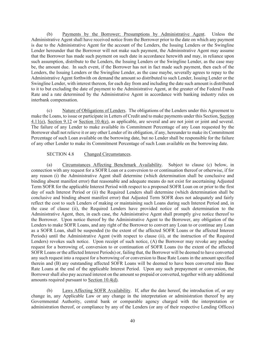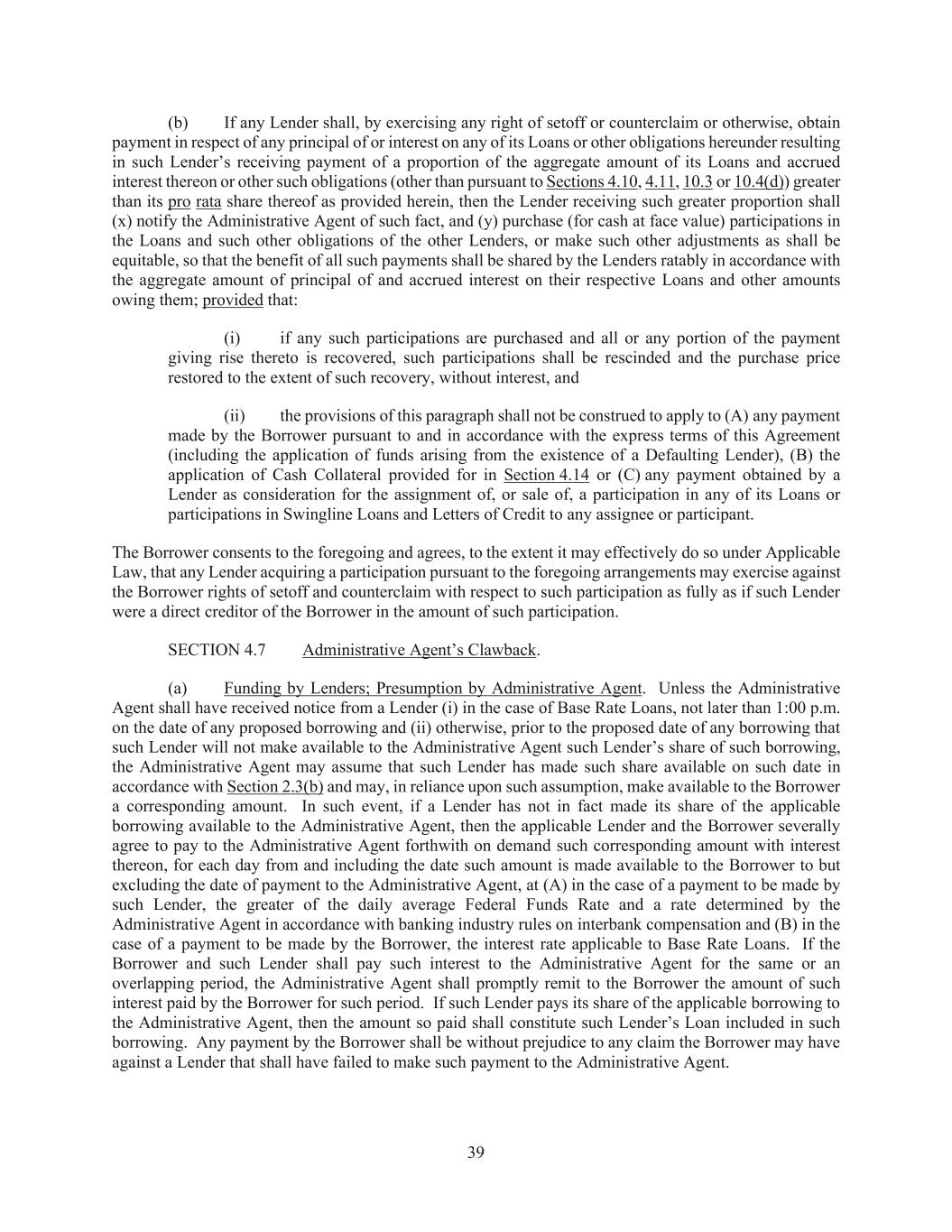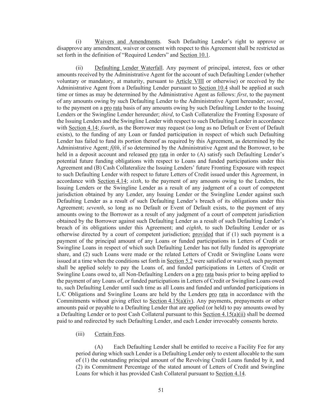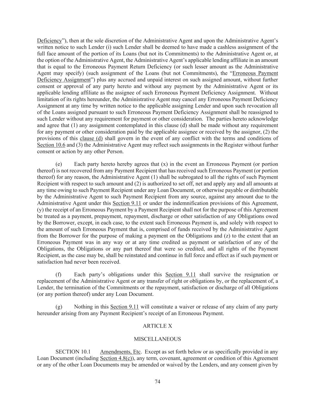 74 Deficiency”), then at the sole discretion of the Administrative Agent and upon the Administrative Agent’s written notice to such Lender (i) such Lender shall be deemed to have made a cashless assignment of the full face amount of the portion of its Loans (but not its Commitments) to the Administrative Agent or, at the option of the Administrative Agent, the Administrative Agent’s applicable lending affiliate in an amount that is equal to the Erroneous Payment Return Deficiency (or such lesser amount as the Administrative Agent may specify) (such assignment of the Loans (but not Commitments), the “Erroneous Payment Deficiency Assignment”) plus any accrued and unpaid interest on such assigned amount, without further consent or approval of any party hereto and without any payment by the Administrative Agent or its applicable lending affiliate as the assignee of such Erroneous Payment Deficiency Assignment. Without limitation of its rights hereunder, the Administrative Agent may cancel any Erroneous Payment Deficiency Assignment at any time by written notice to the applicable assigning Lender and upon such revocation all of the Loans assigned pursuant to such Erroneous Payment Deficiency Assignment shall be reassigned to such Lender without any requirement for payment or other consideration. The parties hereto acknowledge and agree that (1) any assignment contemplated in this clause (d) shall be made without any requirement for any payment or other consideration paid by the applicable assignee or received by the assignor, (2) the provisions of this clause (d) shall govern in the event of any conflict with the terms and conditions of Section 10.6 and (3) the Administrative Agent may reflect such assignments in the Register without further consent or action by any other Person. (e) Each party hereto hereby agrees that (x) in the event an Erroneous Payment (or portion thereof) is not recovered from any Payment Recipient that has received such Erroneous Payment (or portion thereof) for any reason, the Administrative Agent (1) shall be subrogated to all the rights of such Payment Recipient with respect to such amount and (2) is authorized to set off, net and apply any and all amounts at any time owing to such Payment Recipient under any Loan Document, or otherwise payable or distributable by the Administrative Agent to such Payment Recipient from any source, against any amount due to the Administrative Agent under this Section 9.11 or under the indemnification provisions of this Agreement, (y) the receipt of an Erroneous Payment by a Payment Recipient shall not for the purpose of this Agreement be treated as a payment, prepayment, repayment, discharge or other satisfaction of any Obligations owed by the Borrower, except, in each case, to the extent such Erroneous Payment is, and solely with respect to the amount of such Erroneous Payment that is, comprised of funds received by the Administrative Agent from the Borrower for the purpose of making a payment on the Obligations and (z) to the extent that an Erroneous Payment was in any way or at any time credited as payment or satisfaction of any of the Obligations, the Obligations or any part thereof that were so credited, and all rights of the Payment Recipient, as the case may be, shall be reinstated and continue in full force and effect as if such payment or satisfaction had never been received. (f) Each party’s obligations under this Section 9.11 shall survive the resignation or replacement of the Administrative Agent or any transfer of right or obligations by, or the replacement of, a Lender, the termination of the Commitments or the repayment, satisfaction or discharge of all Obligations (or any portion thereof) under any Loan Document. (g) Nothing in this Section 9.11 will constitute a waiver or release of any claim of any party hereunder arising from any Payment Recipient’s receipt of an Erroneous Payment. ARTICLE X MISCELLANEOUS SECTION 10.1 Amendments, Etc. Except as set forth below or as specifically provided in any Loan Document (including Section 4.8(c)), any term, covenant, agreement or condition of this Agreement or any of the other Loan Documents may be amended or waived by the Lenders, and any consent given by